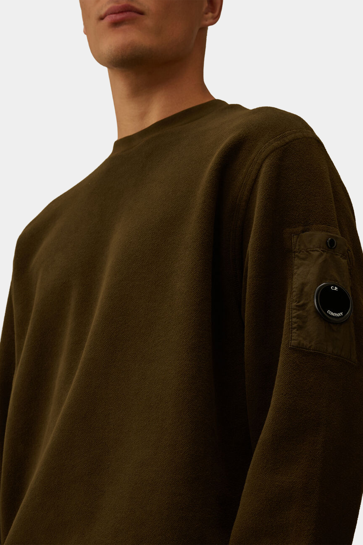 Felpa girocollo realizzata in fleece di cotone diagonale garzato e smerigliato con inserti in woven twill. È presente un taschino sul braccio con l'iconica Lente di C.P. Company e polsini e orlo a costine. La felpa è tinta in capo e presenta una vestibilità regolare.