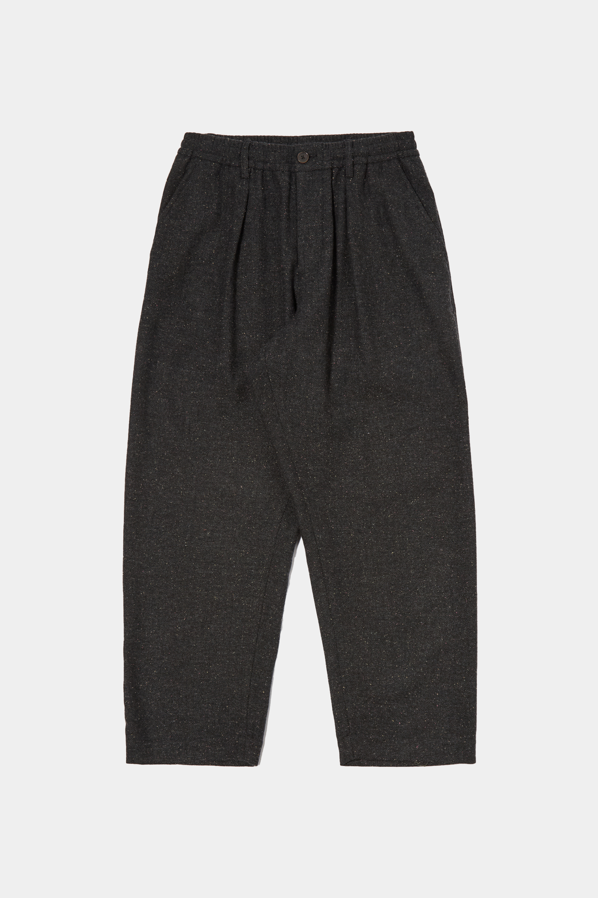 Pantaloni realizzati in misto lana con pences e vita elasticizzata regolabile con coulisse, chiusura con bottoni. Sono presenti tasche laterali e tasche posteriori con patta e bottone. Il pantalone presenta una vestibilità ampia e affusolata.