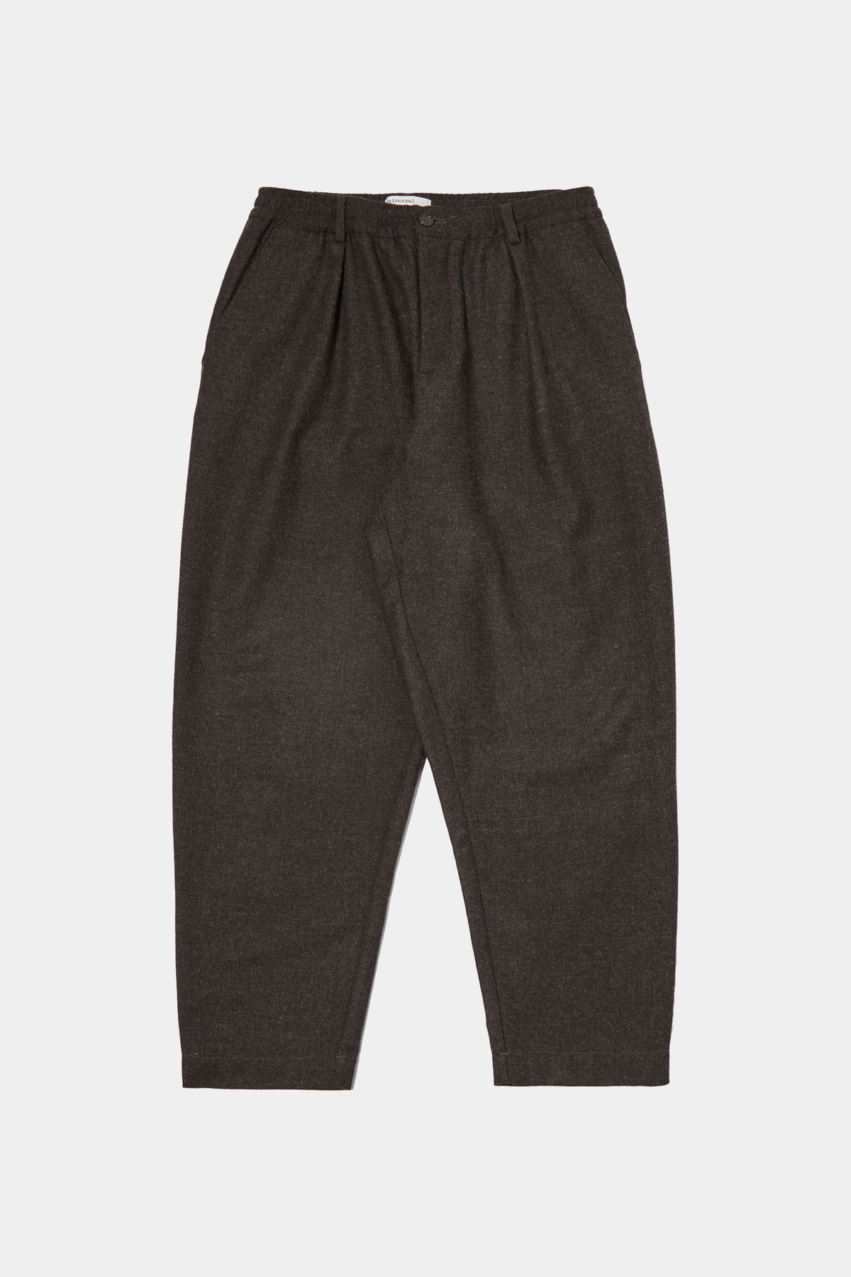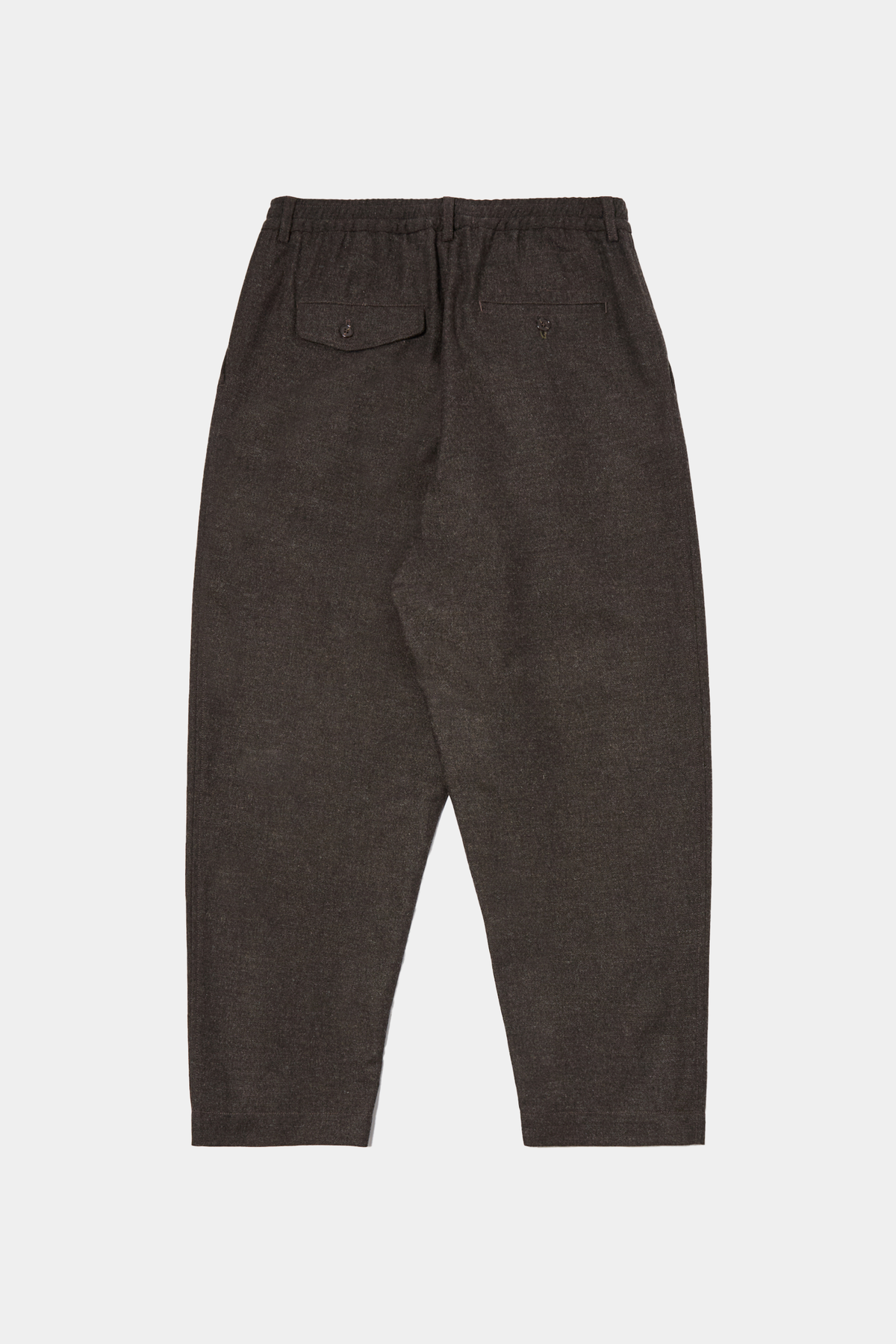 Pantaloni con pences e vita elasticizzata regolabile con coulisse, chiusura con bottoni. Sono presenti tasche laterali e tasche posteriori con patta e bottone. Il pantalone presenta una vestibilità ampia e affusolata.