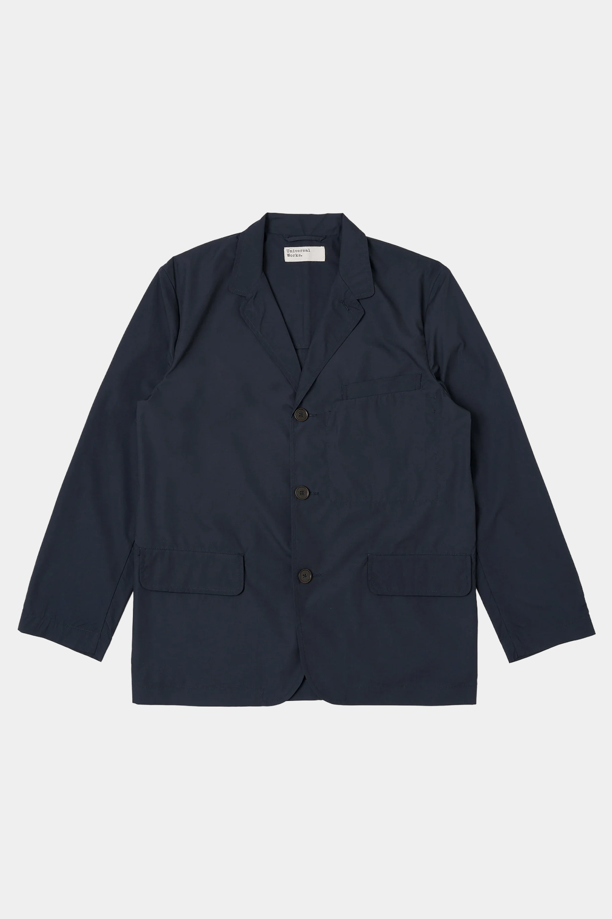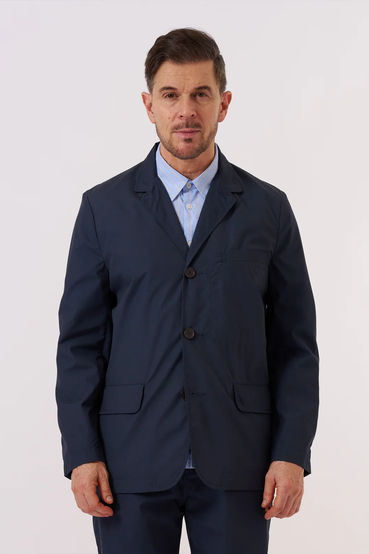 Giacca con colletto rever e abbottonatura frontale monopetto, sono presenti due tasche a filetto con patta frontali, un taschino a filetto sul petto, una taschina interna e polsini con bottoni. La giacca è destrutturata e sfoderata e presenta una vestibilità rilassata con spacco posteriore.