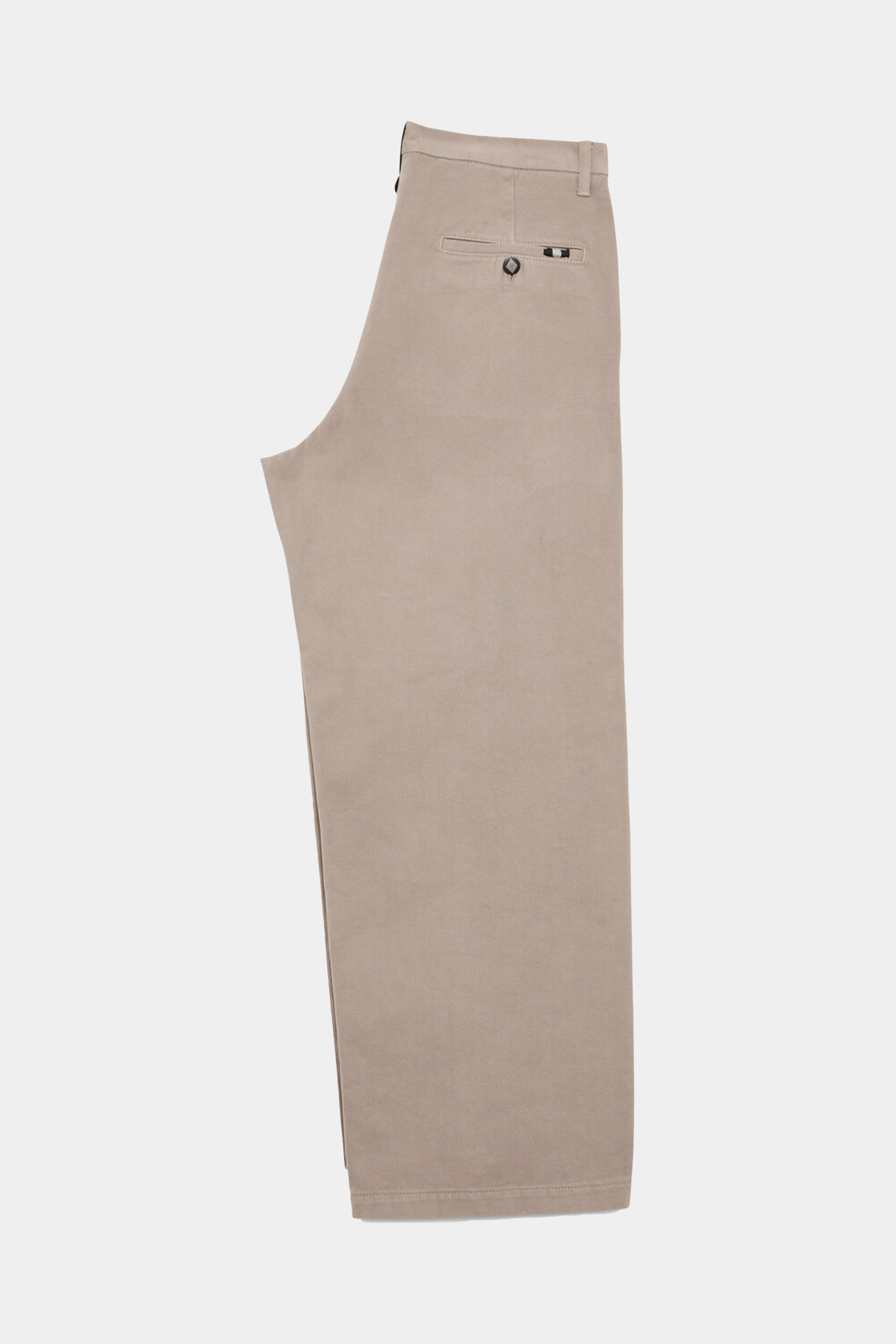 Pantaloni chino realizzati in bull di cotone, chiusura con cerniera e bottone e passanti per cintura. Sono presenti tasche laterali a filetto e tasche posteriori a filetto con bottone. Il pantalone presenta una vita media con gamba ampia e rilassata.