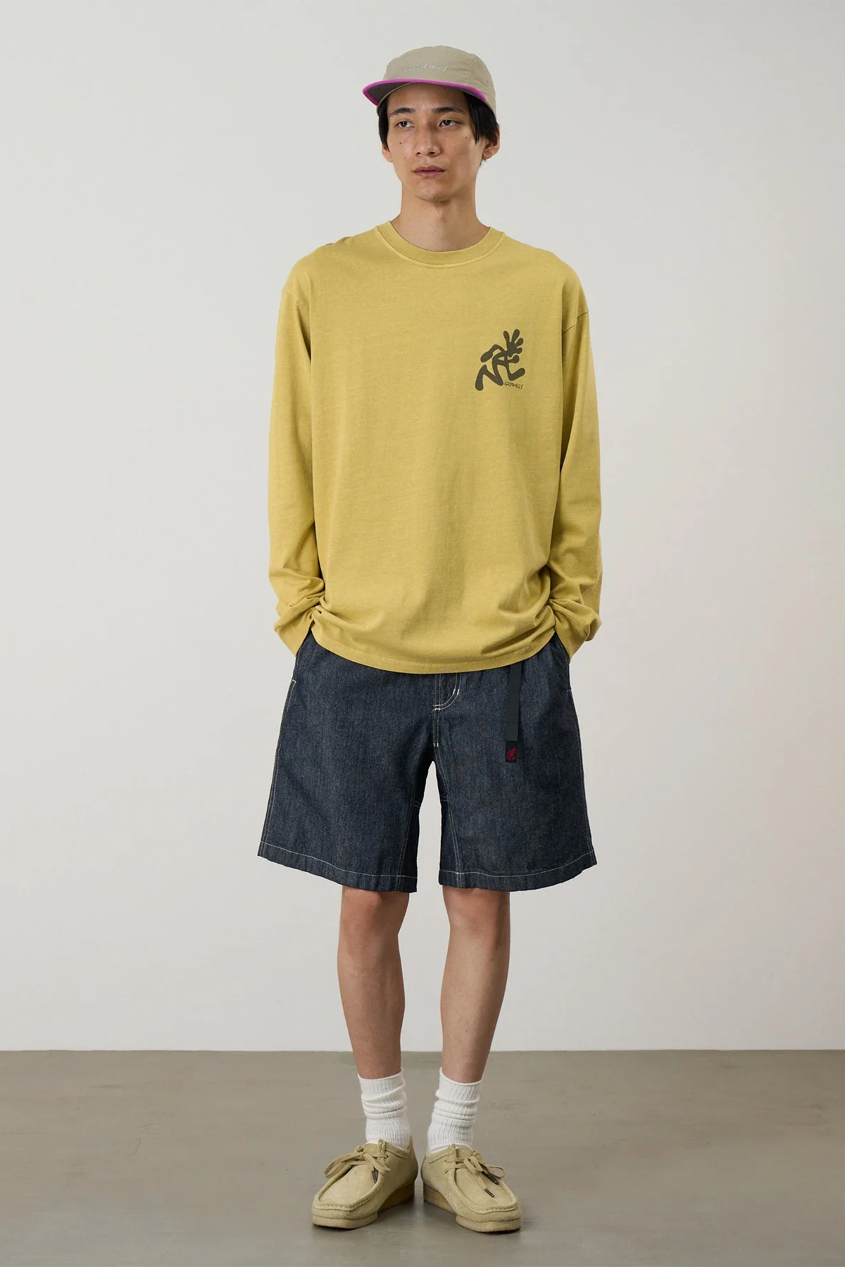 Bermuda realizzati in tessuto chambray giapponese con vita elasticizzata regolabile con laccio e fettuccia. Sono presenti tasche a filetto laterali e tasche a filetto posteriori. Il bermuda presenta una gamba rilassata.