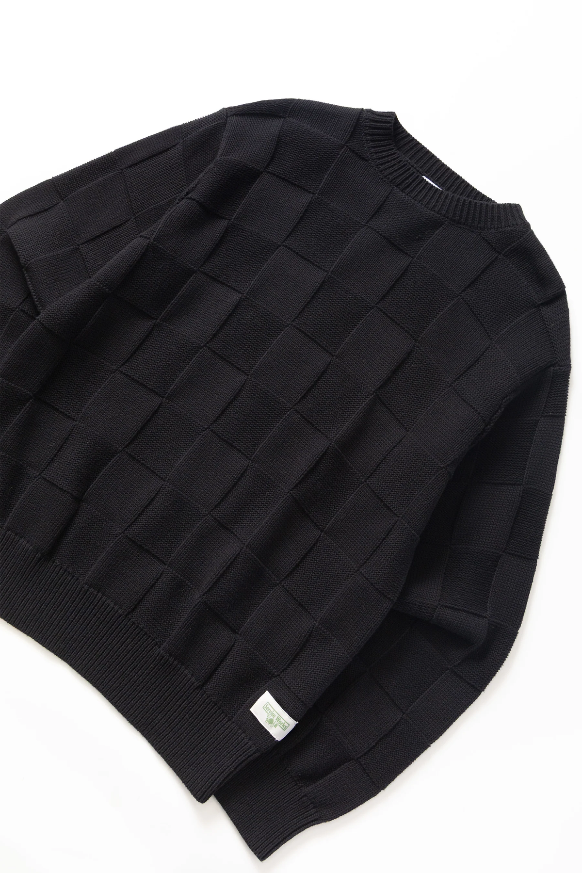 Maglia di cotone girocollo, lavorata con un effetto a scacchiera. Polsini collo e fondo lavorati a costine.
