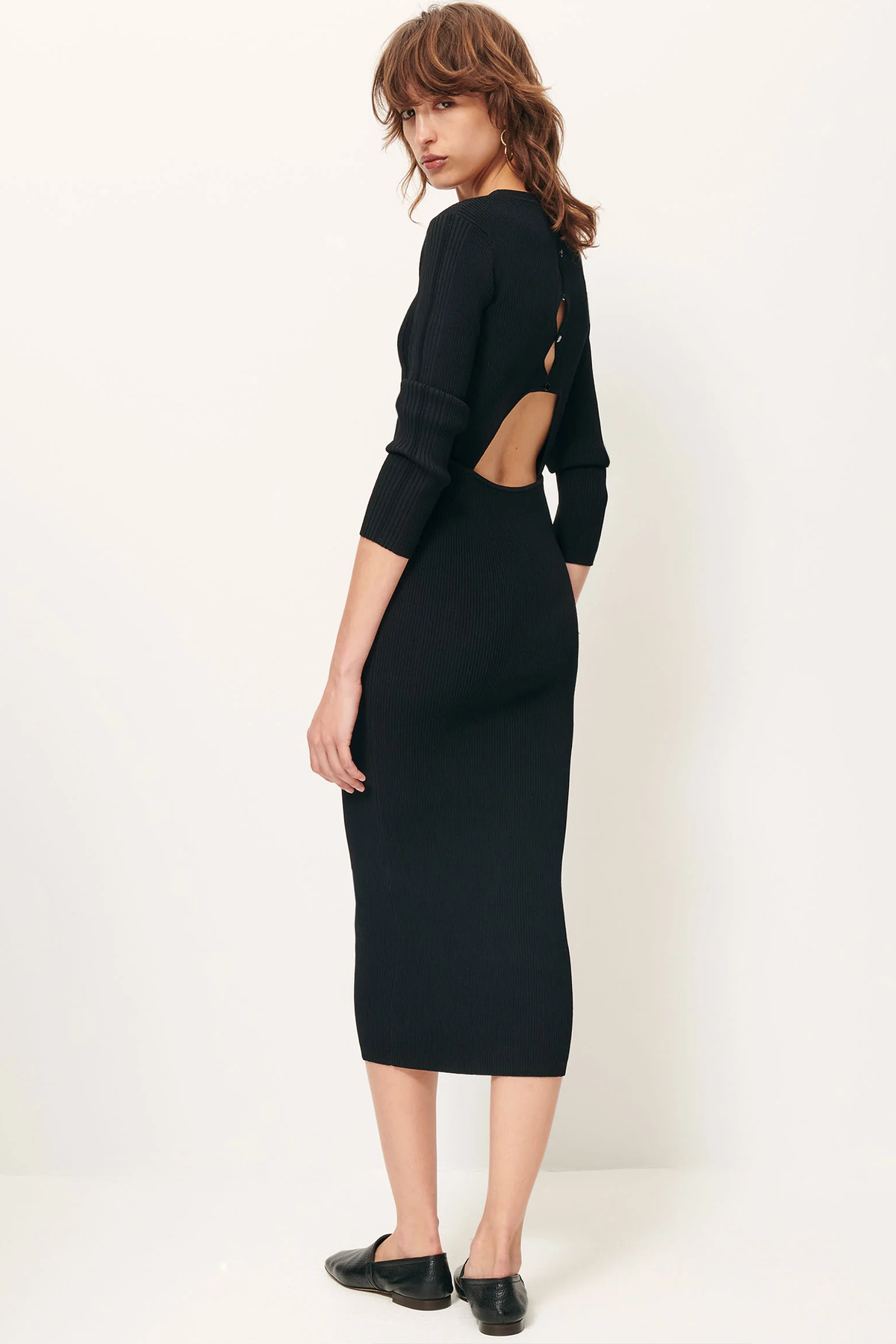 Abito midi aderente realizzato in maglia fine a costine,. Presenta maniche lunghe, scollo rotondo e schiena scoperta impreziosita da bottoni gioiello tono su tono.