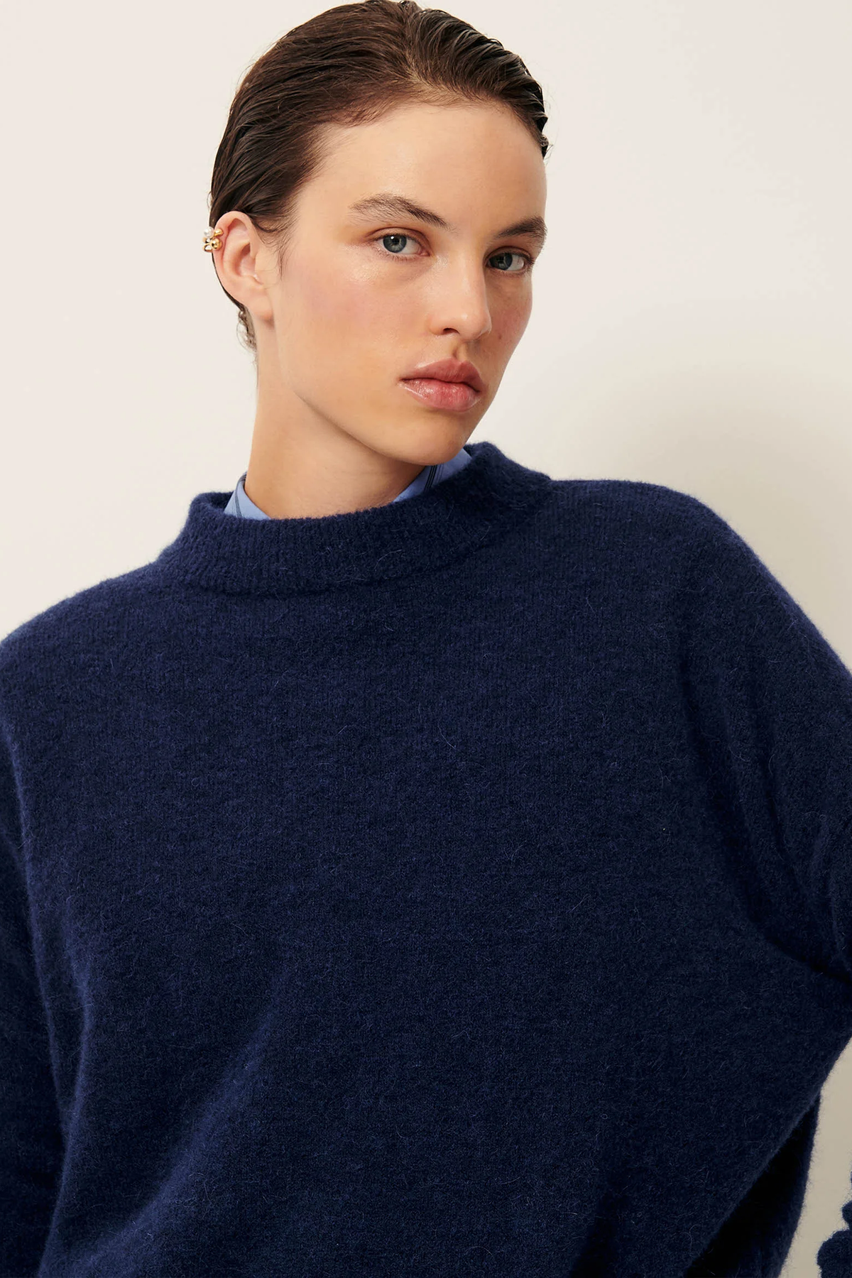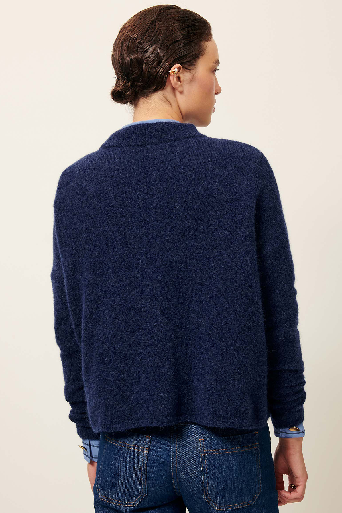 Maglia a collo alto realizzata in misto alpaca e lana merino, presenta una vestibilità ampia e boxy con spalla scesa.