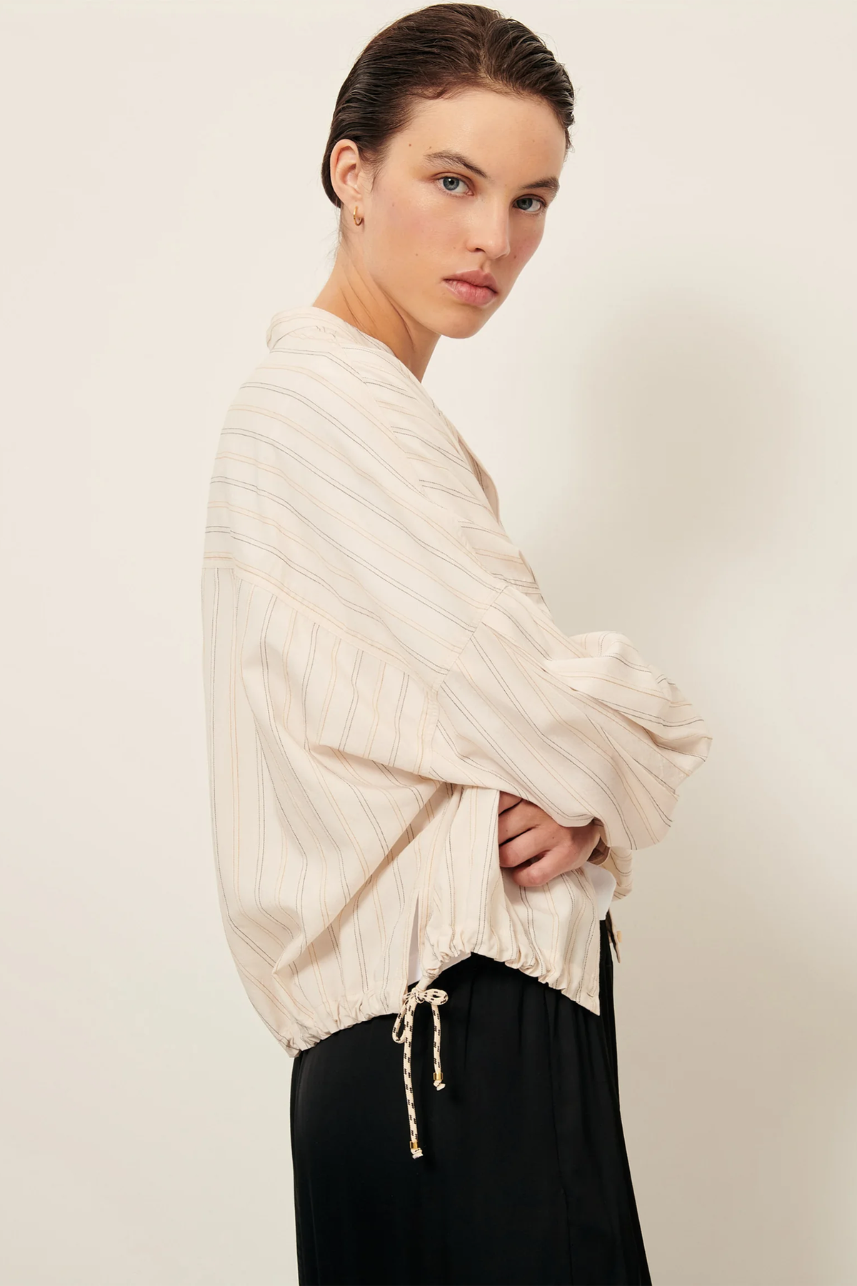 Camicia a righe realizzata in morbido popeline con scollo rotondo e abbottonatura frontale. Sono presenti tasche applicate sul petto, spalle scese con piega e cannoncino. La camicia inoltre è dotata di coulisse in vita regolabile.