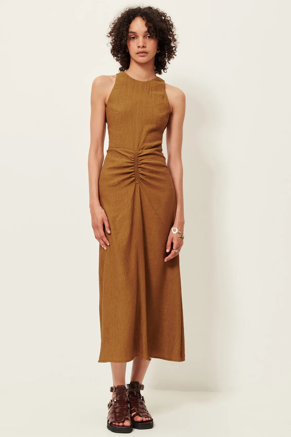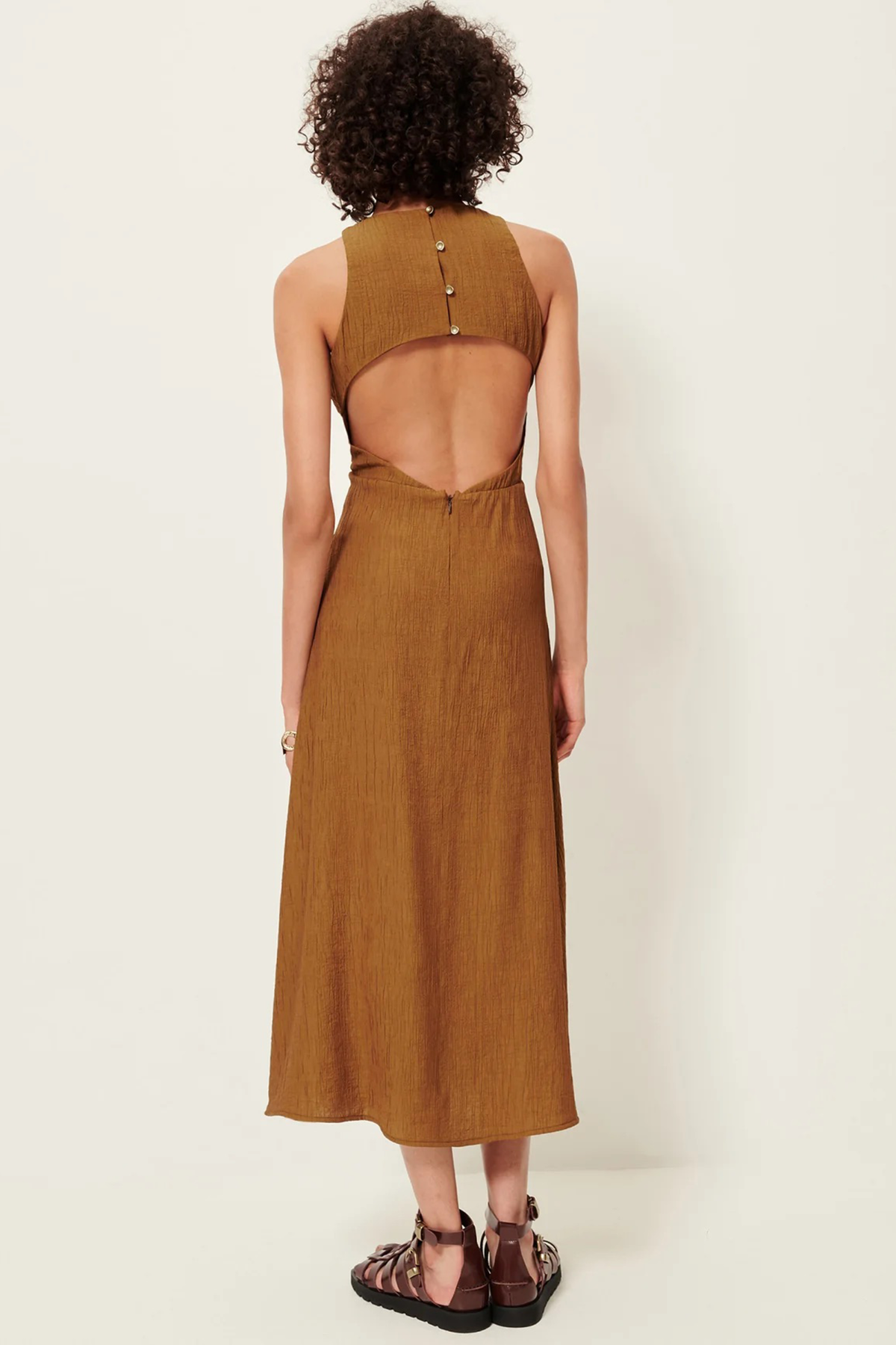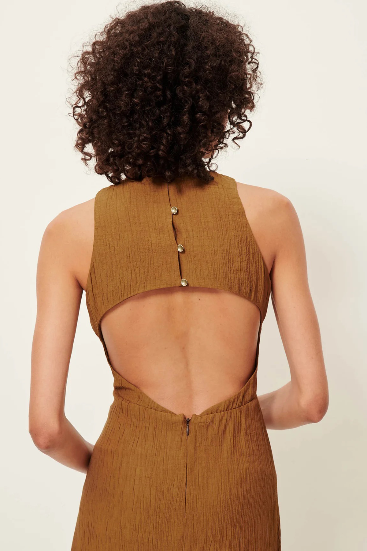 Abito midi senza maniche realizzato in morbido crêpon seersucker di viscosa, ha una chiusura posteriore con bottoni e cerniera. Sono presenti dettagli arricciati in vita e schiena scoperta.