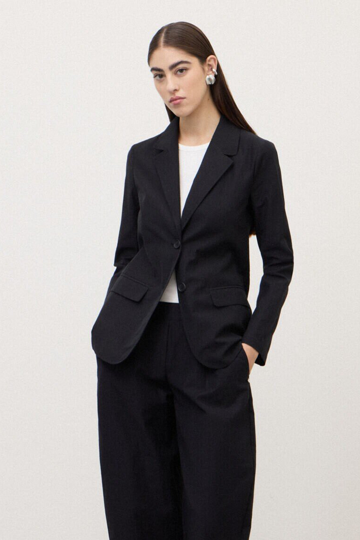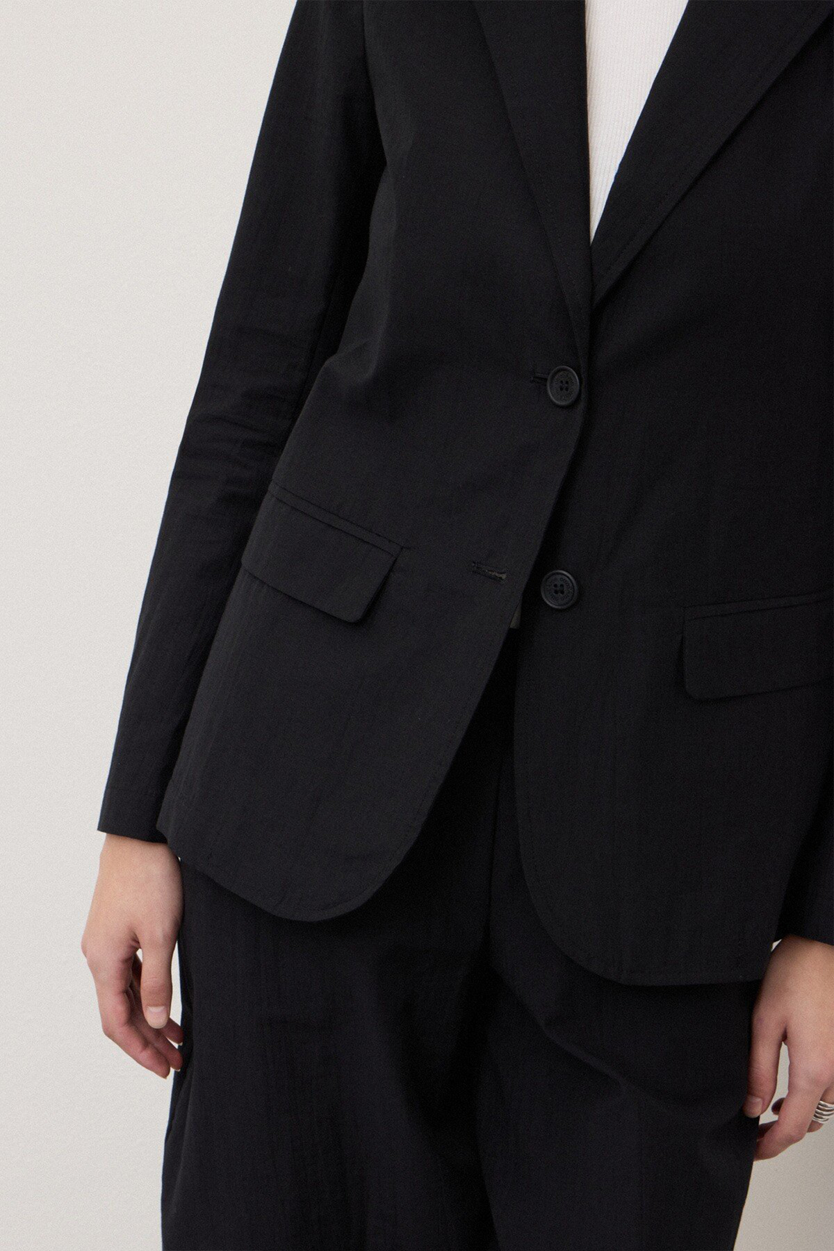 Giacca monopetto realizzata in tessuto dall’effetto grinzato con rever classico e abbottonatura frontale, sono presenti due tasche a filetto con patta frontali. La giacca presenta una vestibilità regolare.