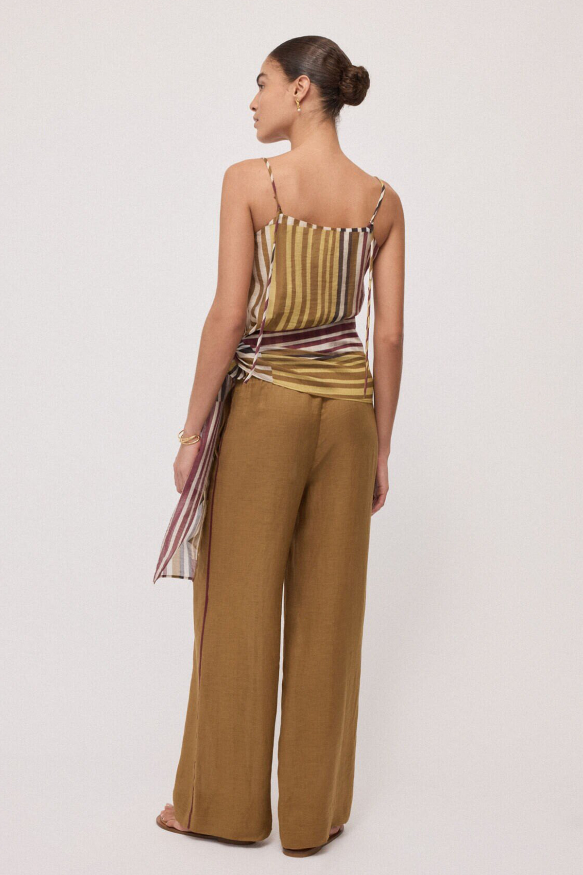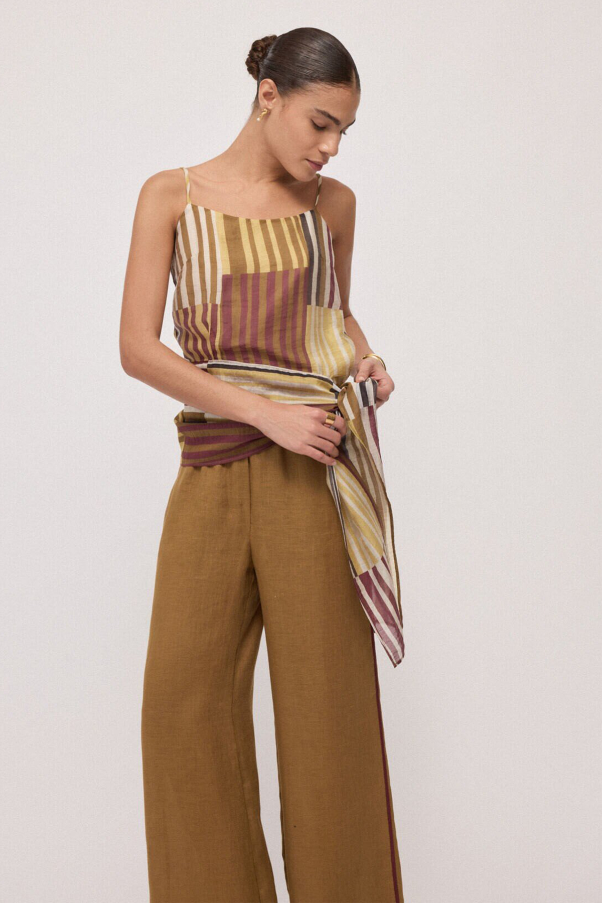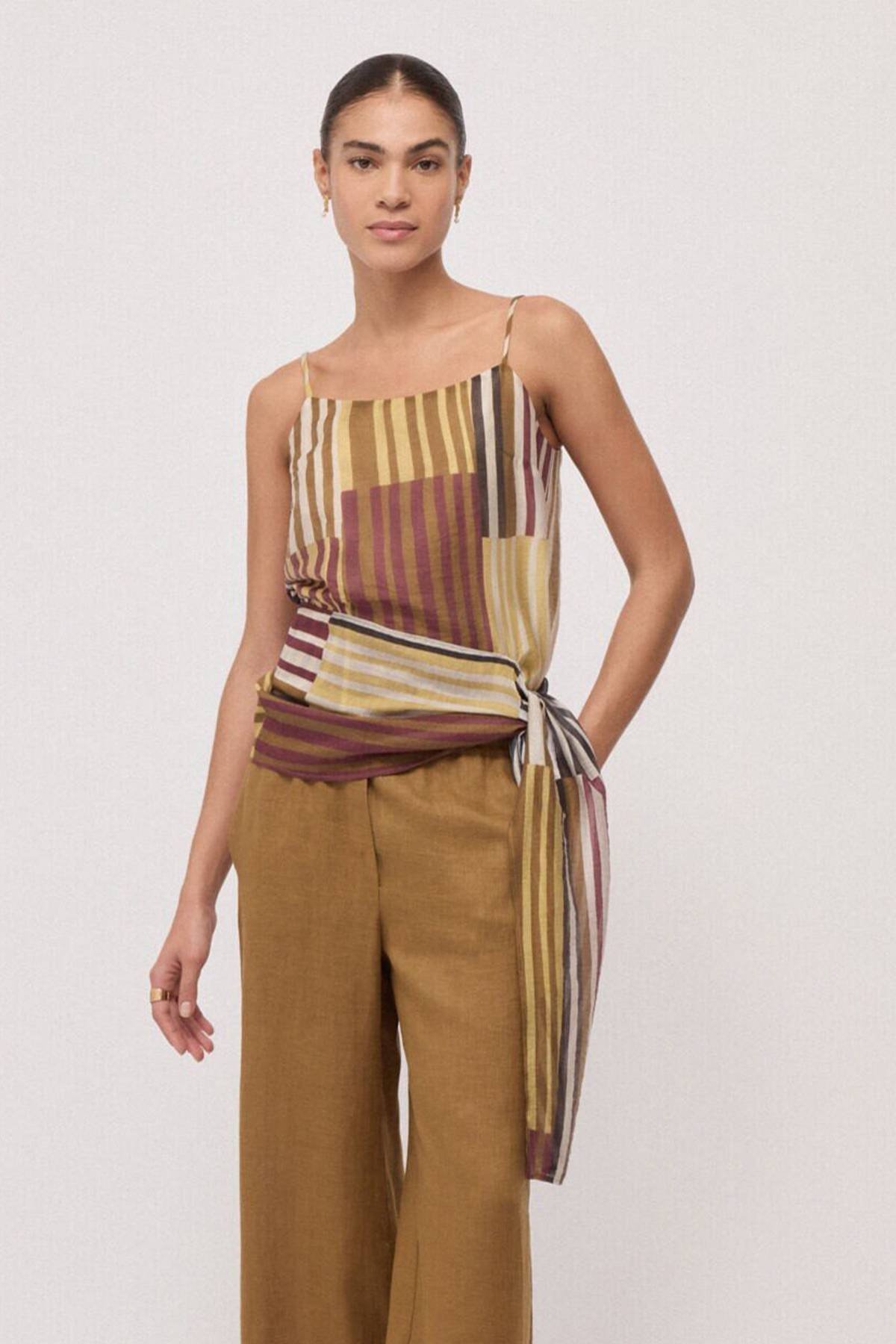 Top a righe con spalline sottili regolabili, è presente una fodera interna ed un fiocco laterale da annodare in vita.