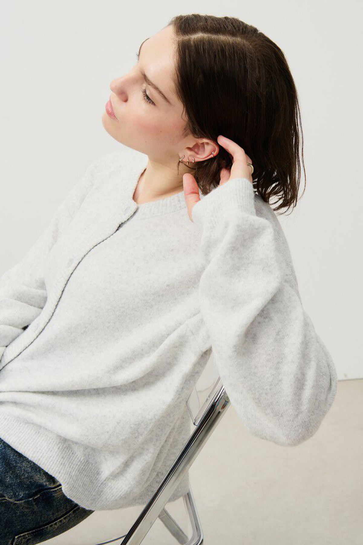 Cardigan realizzato in misto lana, girocollo con abbottonatura frontale. Presenta bordi a coste con una taglio bombato ed una vestibilità over.