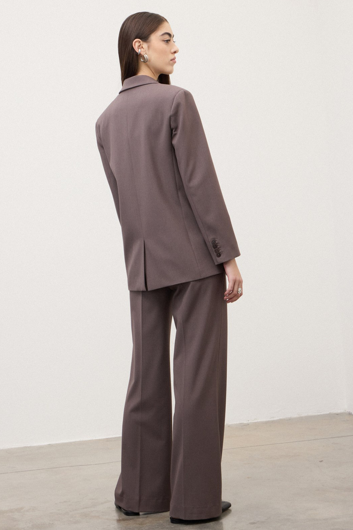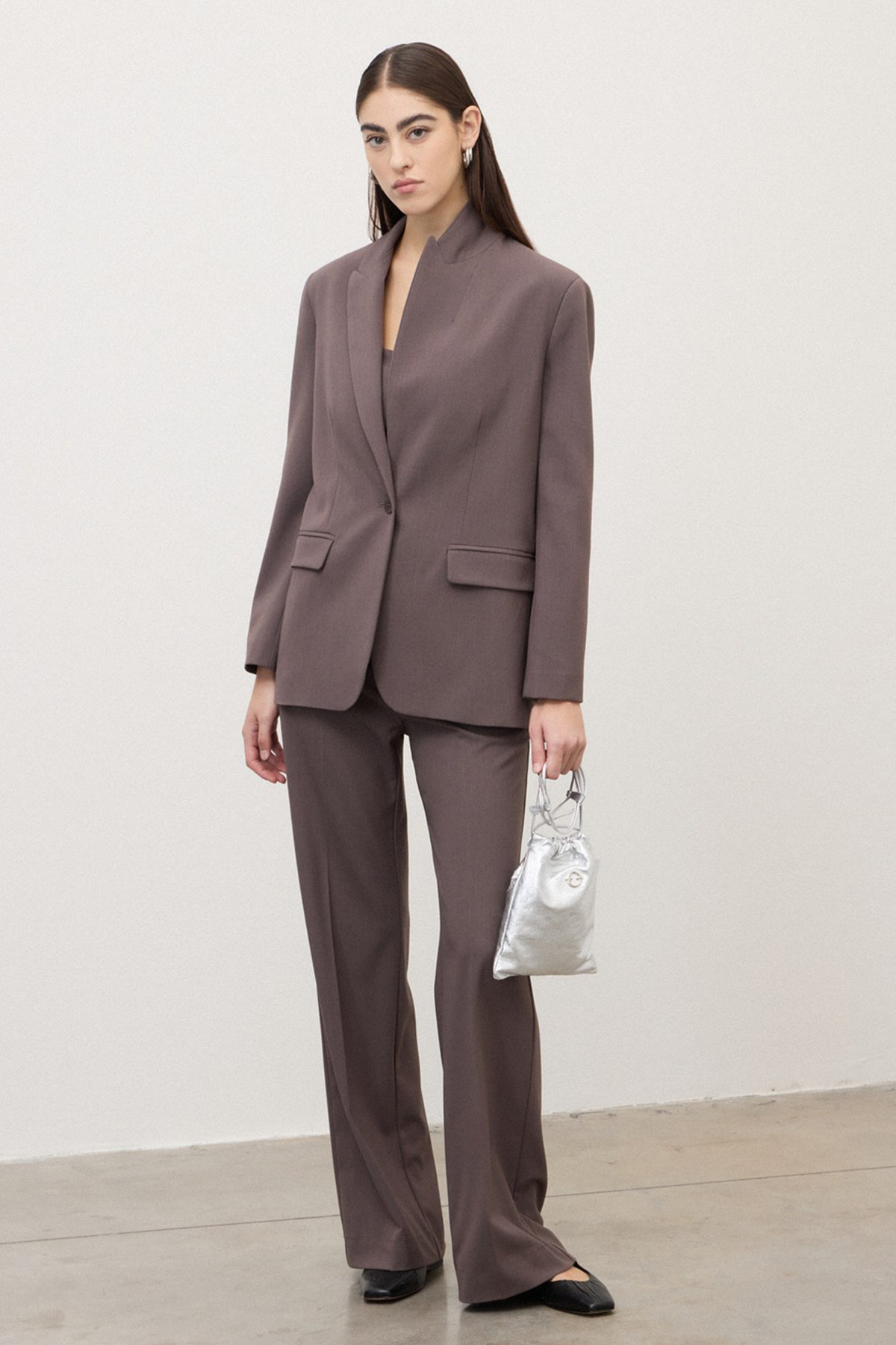 Giacca monopetto con collo revers e abbottonatura frontale, sono presenti due tasche a filetto con patta frontali e spalline imbottite. La giacca presenta una vestibilità regolare.