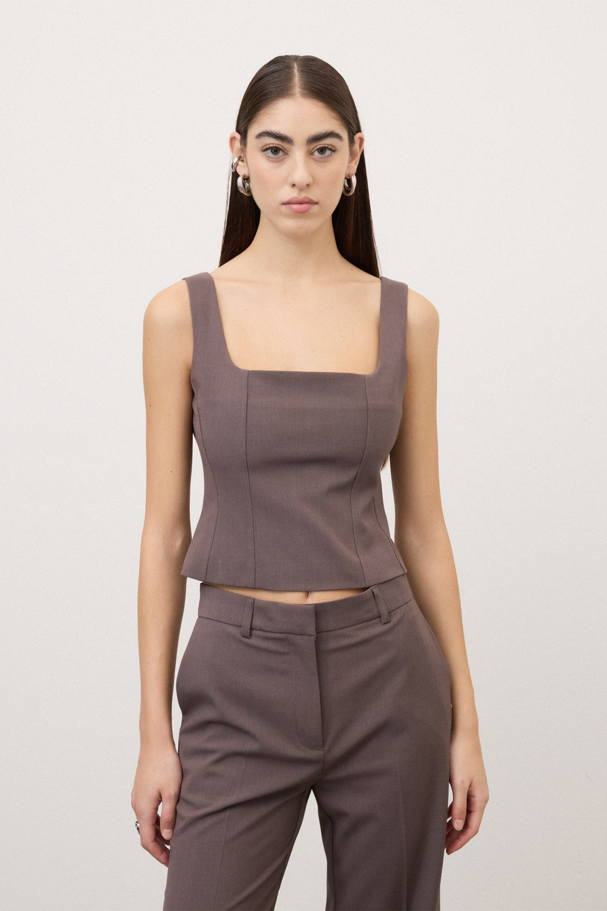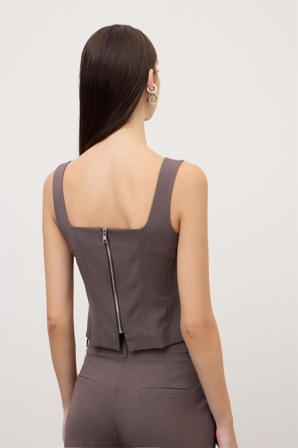 Top tipo bustino con spalline e scollo quadrato, presenta una chiusura con cerniera sulla schiena. Il top ha una vestibilità regolare e crop.