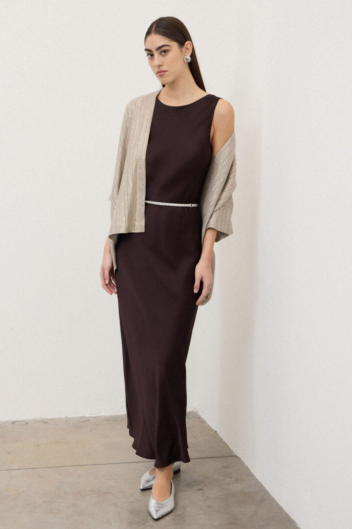 Abito lungo realizzato in raso di viscosa, presenta uno scollo profondo sulla schiena ed un taglio fluido.