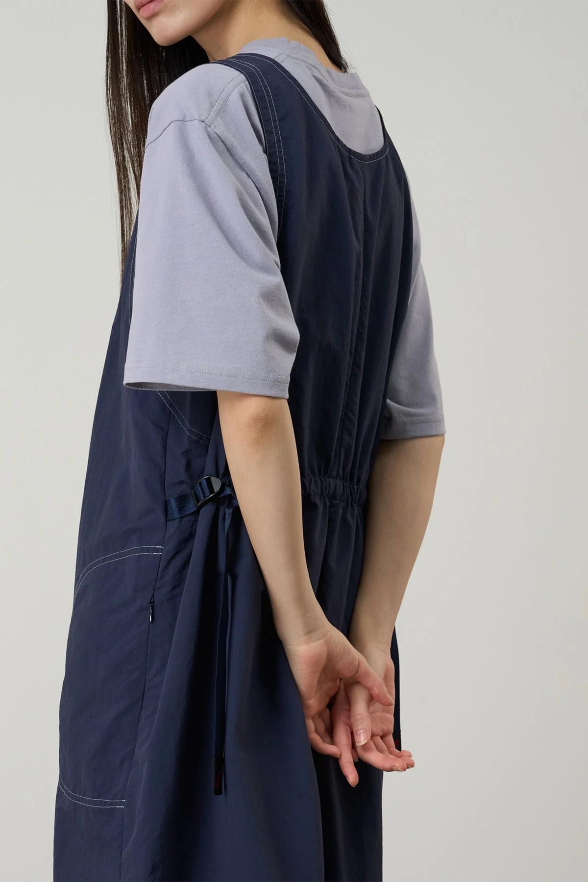 Abito midi realizzato in nylon riciclato, è smanicato e presenta uno scollo rotondo. Sono presenti tasche a filetto con cerniera laterali, vita regolabile con laccio e fettuccia e orlo regolabile con coulisse nascosta.