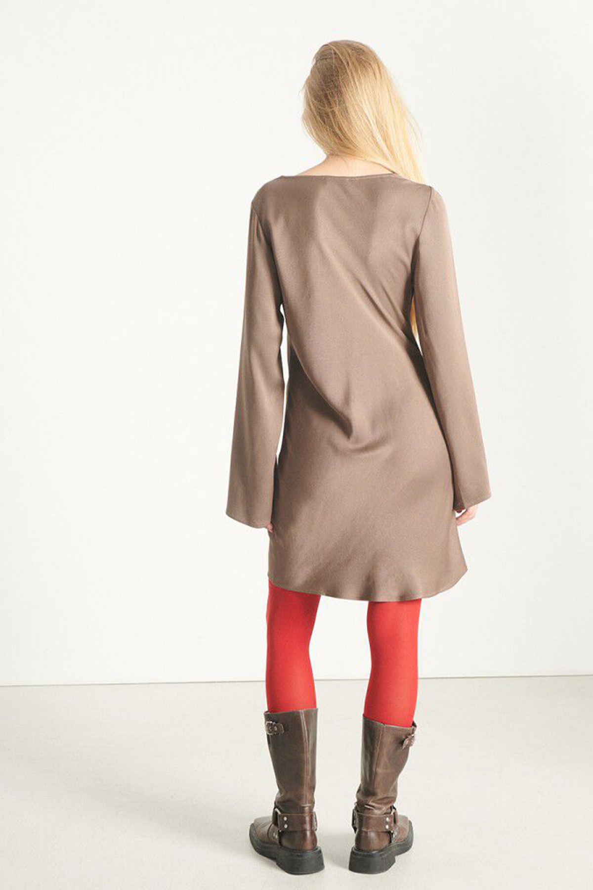 Abito corto satin con manica lunga a pipistrello e scollo a cascata. L'abito veste leggermente aderente.