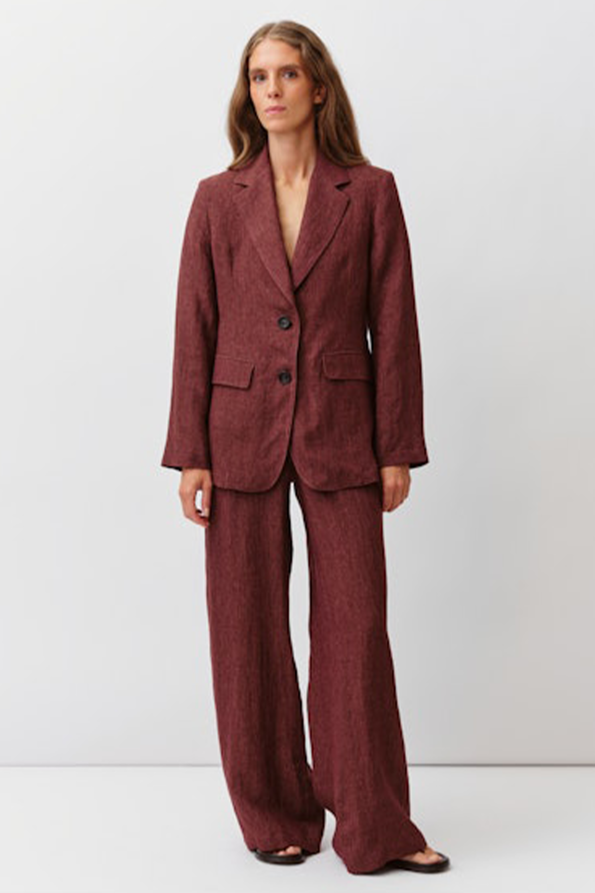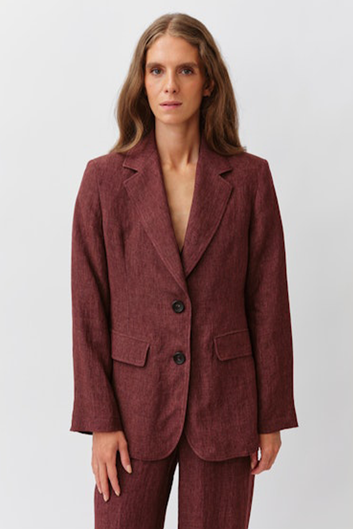 Giacca monopetto realizzata in lino con collo revers a punta e abbottonatura frontale, sono presenti due tasche a filetto con patta laterali. la giacca presenta un taglio aderente e strutturato.