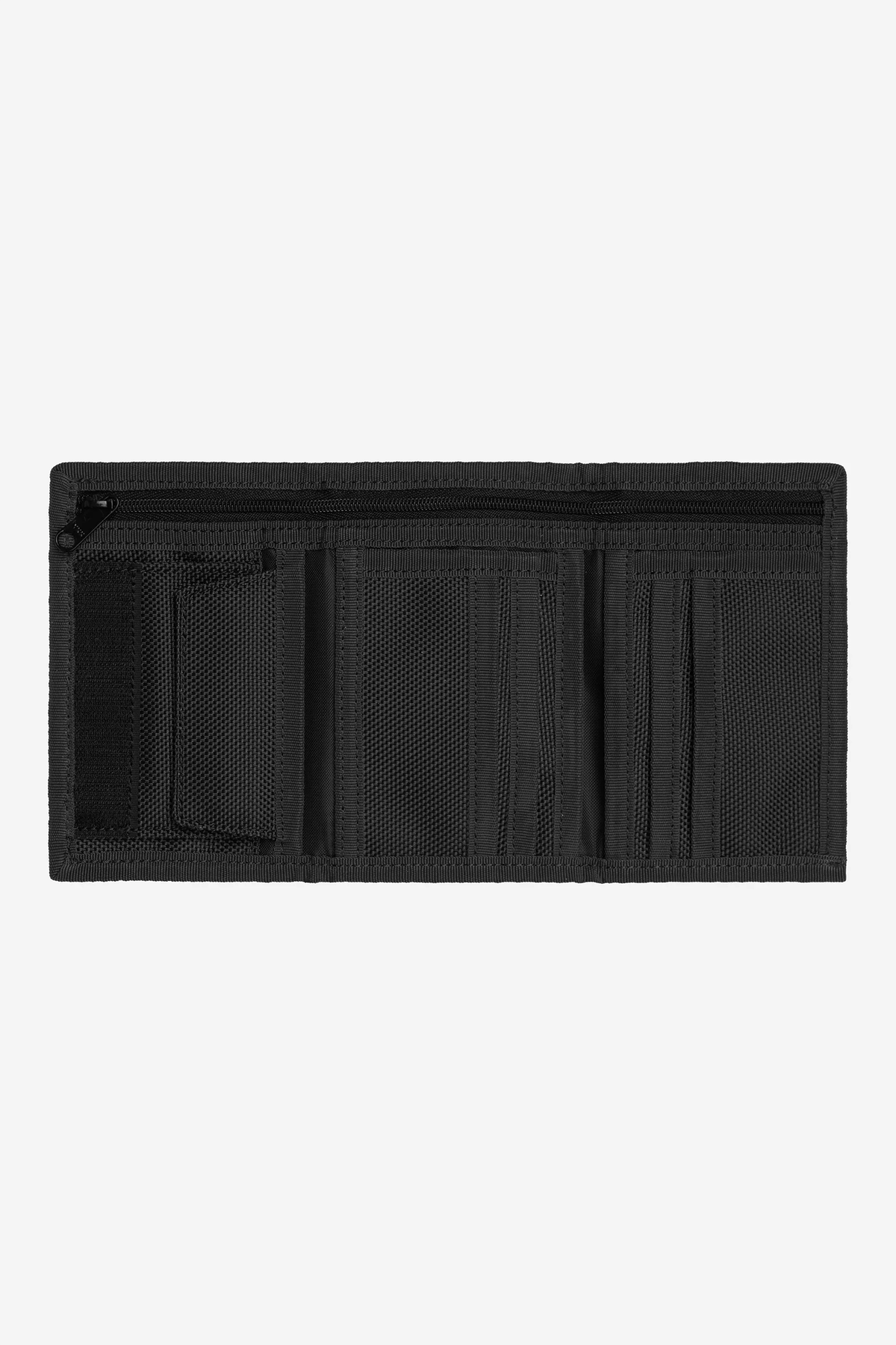 Portafoglio realizzato in nylon pesante con proprietà impermeabili. Il modello tri-fold è dotato di chiusura con Velcro® e di numerose tasche, tra cui uno scomparto per banconote con zip, uno scomparto per monete e sei scomparti per tessere. La parte frontale è impreziosita da un’etichetta quadrata in tessuto.