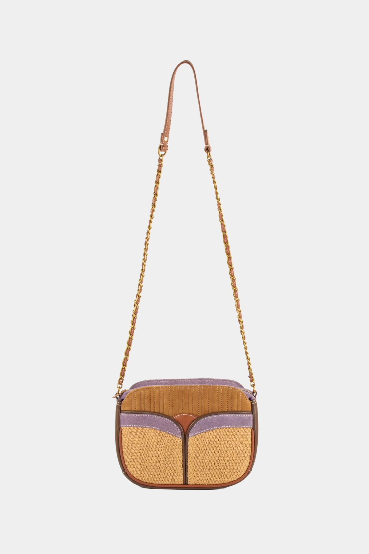 Borsa realizzata in mix di materiali in pelle di agnello, con inserti in rafia e pelle di capretta scamosciata. Dettagli in pelle di vacchetta scamosciata e pelle di vacchetta.