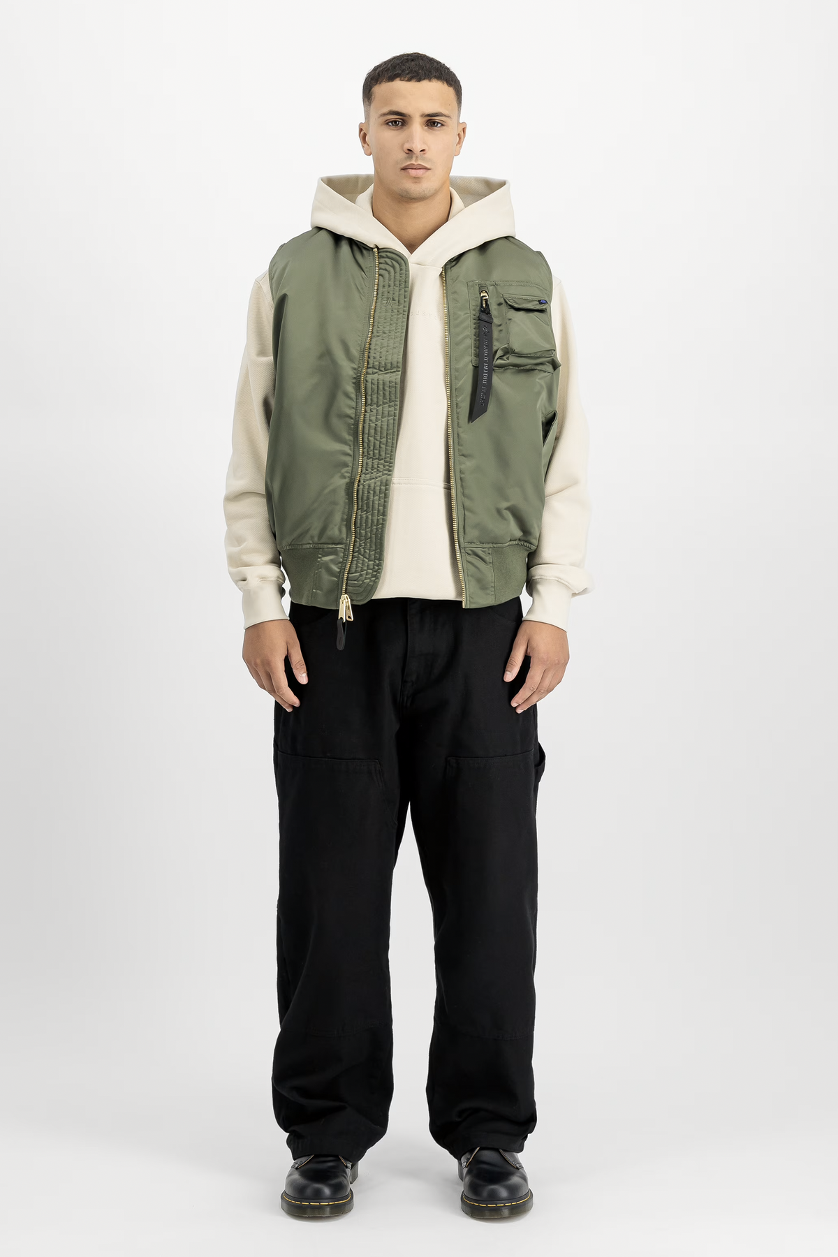 Gilet unisex in stile militare dal design reversibile é realizzato in Heavy Flight Nylon con imbottitura 3M Thinsulate. Il gilet presenta una chiusura con cerniera e collo a costine, sono presenti tasche a diletto oblique con patta, un taschino sul petto con Tag rimovibile e due tasche interne a filetto oblique. Il capo presenta una vestibilità rilassata.