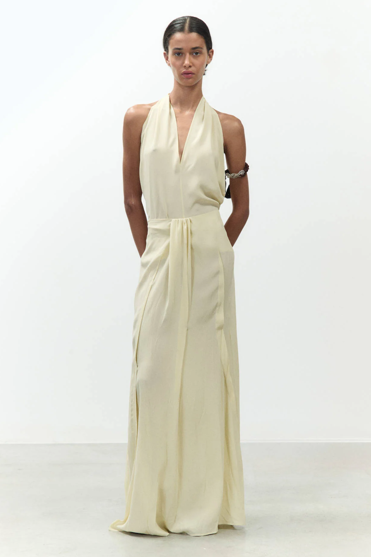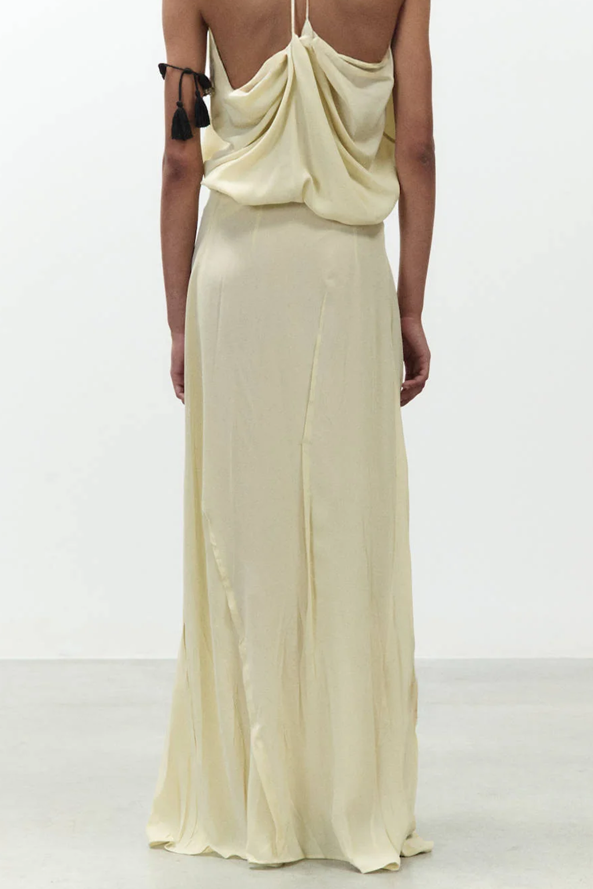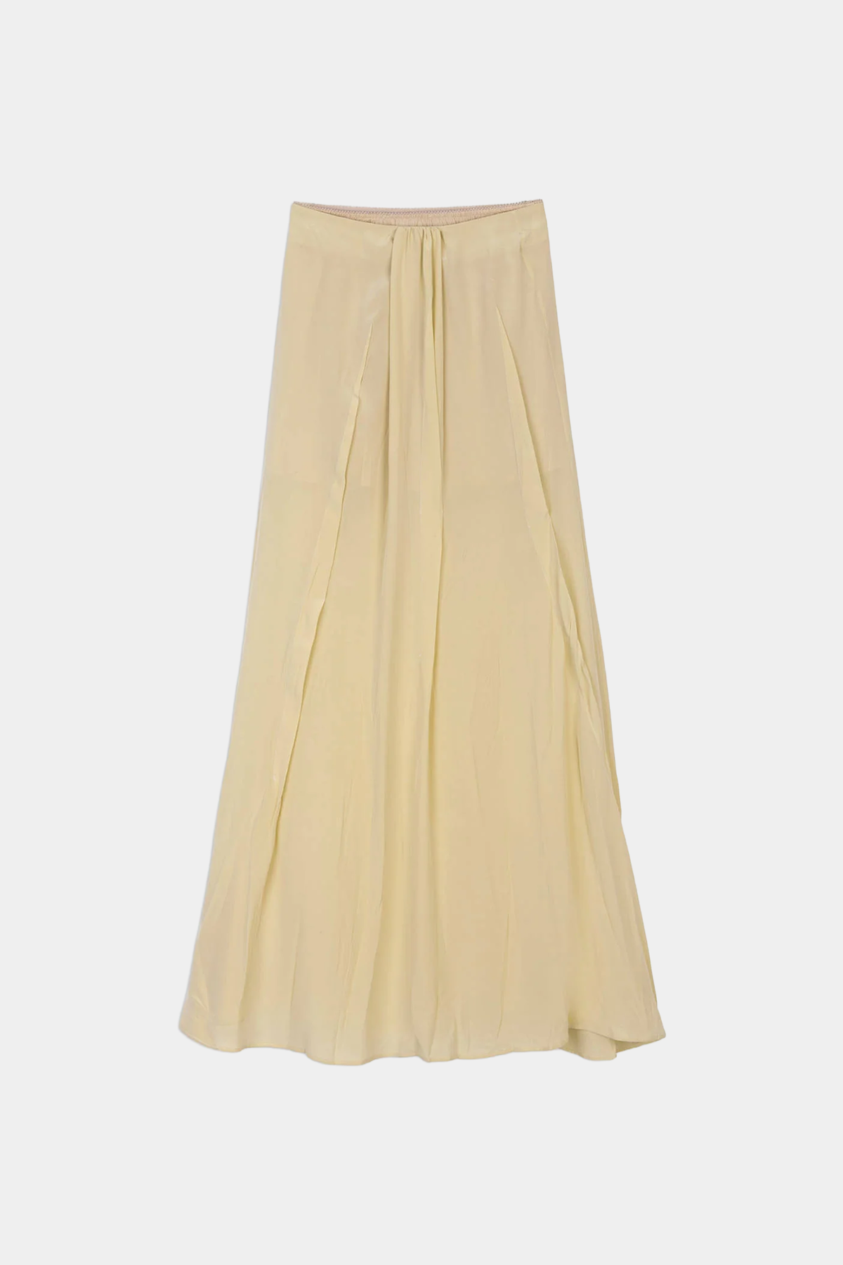Gonna lunga di seta realizzata in tessuto dall'effetto stropicciato con chiusura laterale con cerniera. La gonna presenta un drappeggio frontale, dettaglio pieghe stirate ed una sottoveste corta.