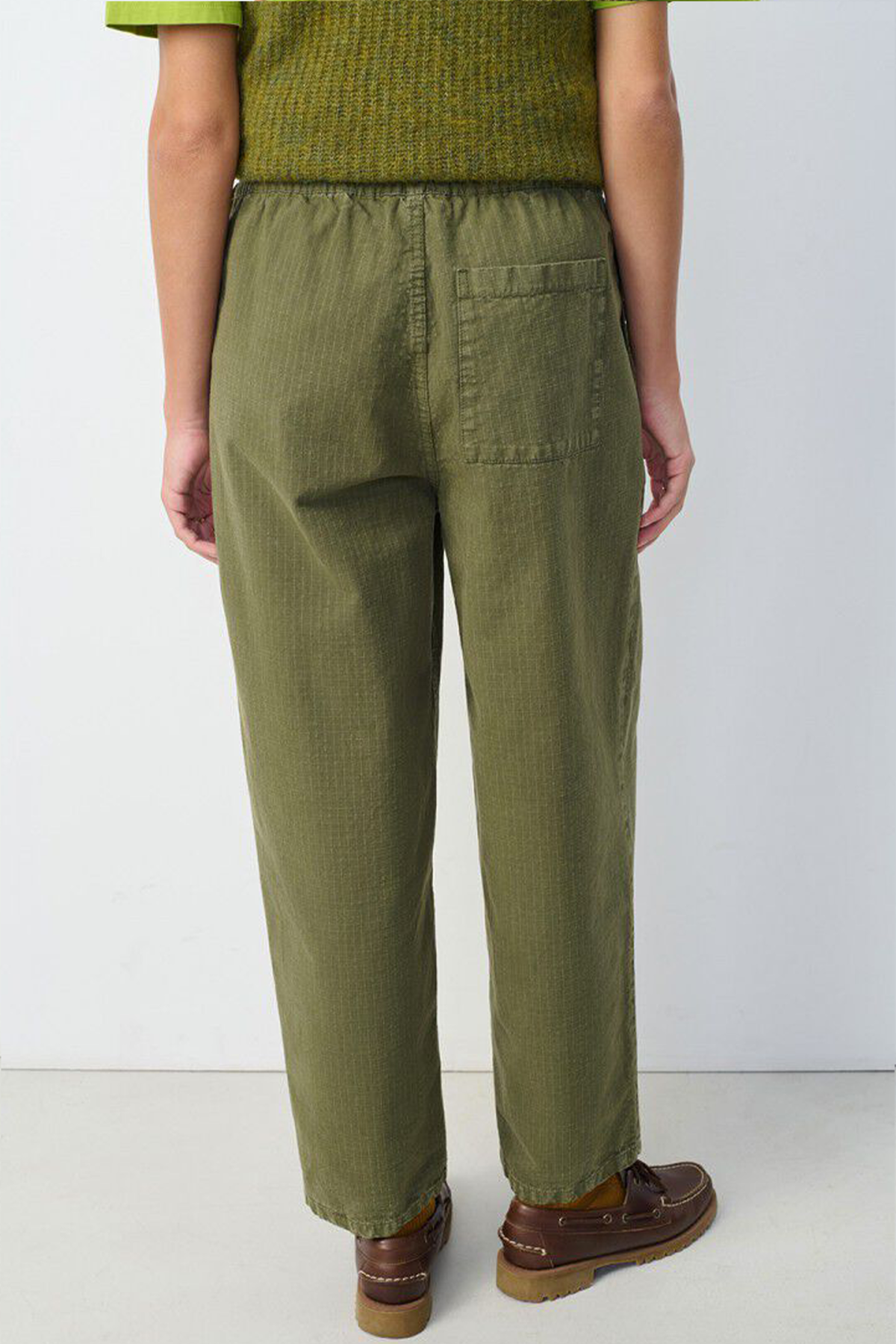 Pantalone realizzato i ripstop di cotone carrot fit crop, ha pences frontali e vita elasticizzata regolabile con coulisse Presenta tasche a filetto laterali e una tasca a toppa posteriore. La gamba è ampia, più coda sula coscia e si stringe leggermente sulla caviglia rianendo però comoda.