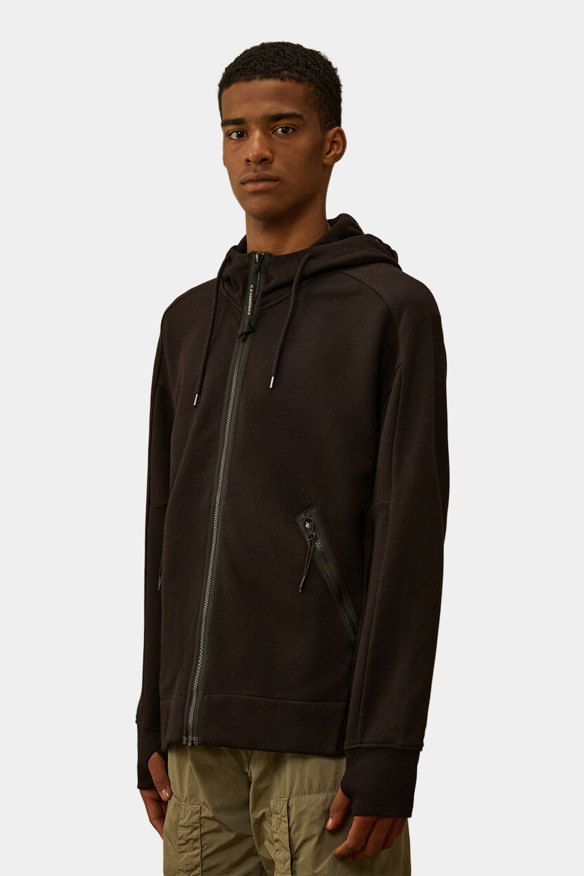 Felpa con cappuccio Goggle realizzata in Diagonal Raised Fleece, un cotone spazzolato a trama diagonale di peso medio. Il tessuto morbido assicura comfort e libertà di movimento. Il capo presenta l'iconico cappuccio regolabile con lenti Goggle di C.P. Company, tasche laterali con zip, polsini e orlo a costine e fori per i pollici sui polsini.
