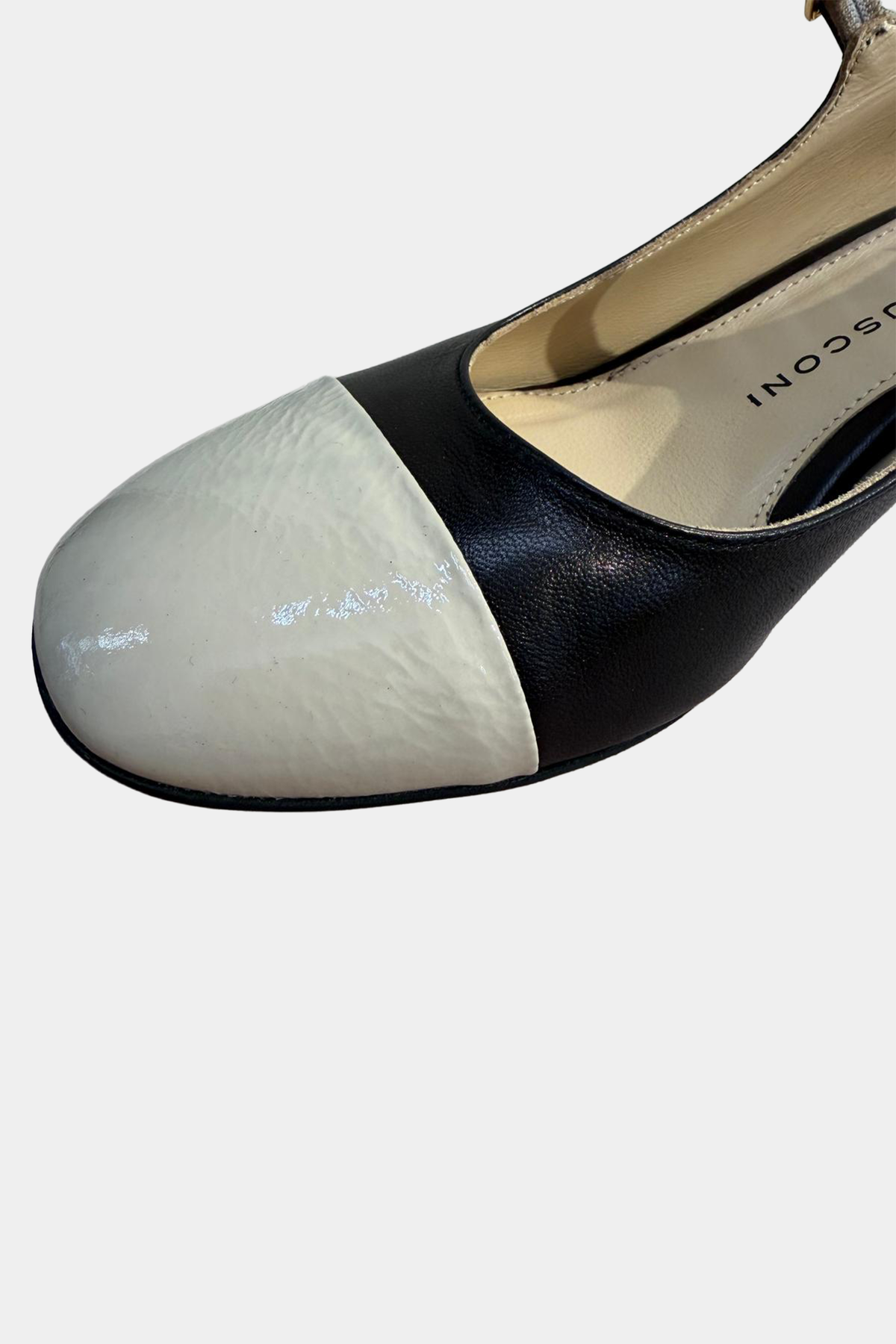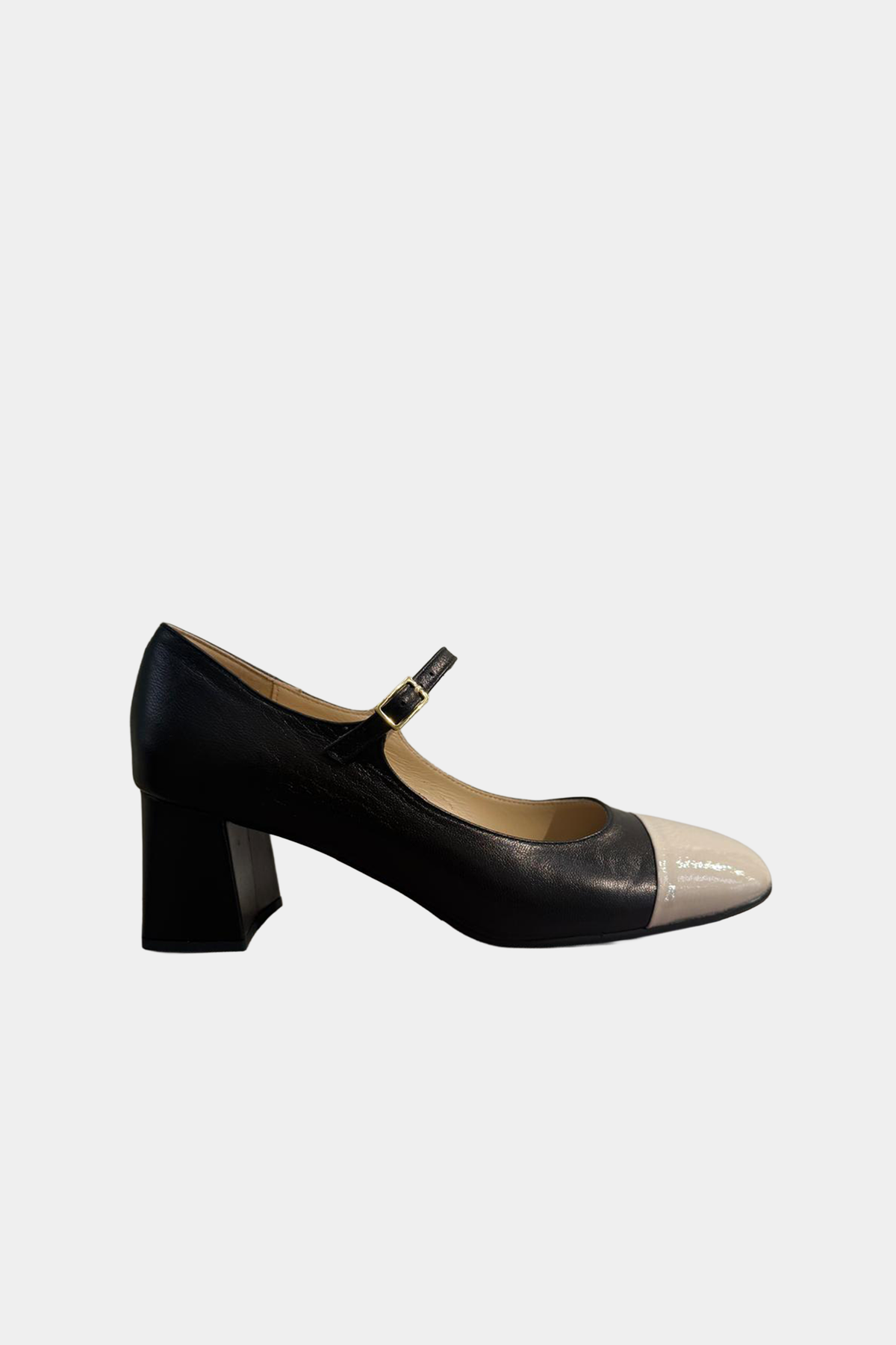 Mary Jane realizzata in pelle con cinturino regolabile e punta a contrasto colore in vernice.