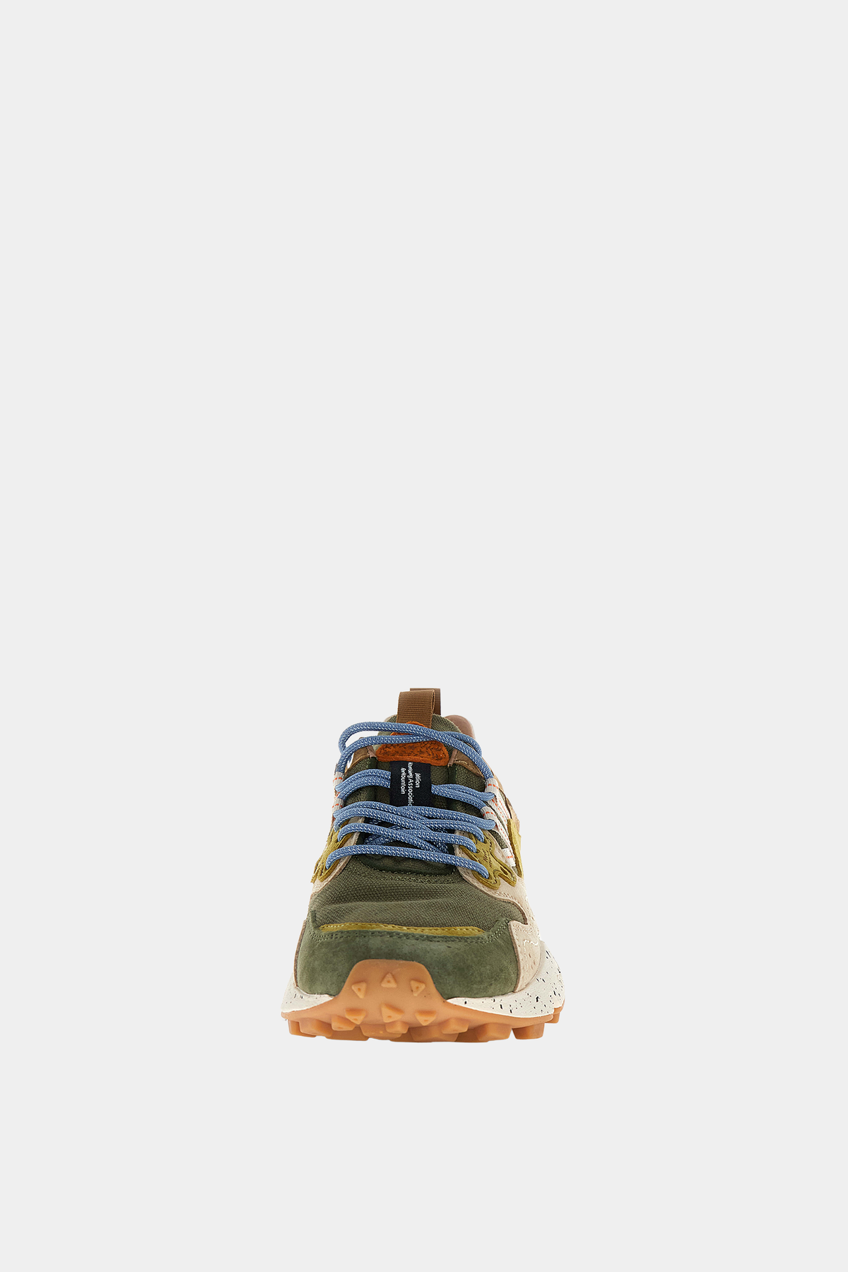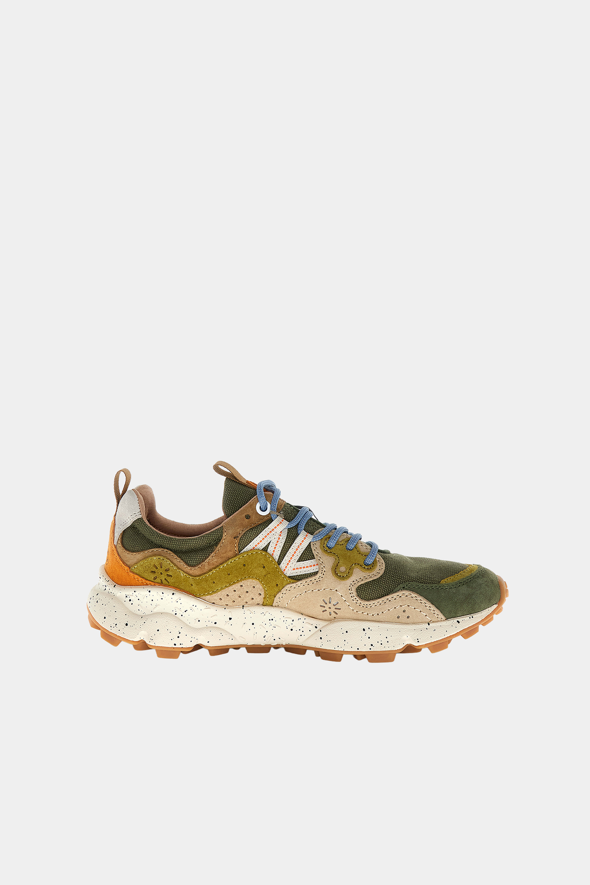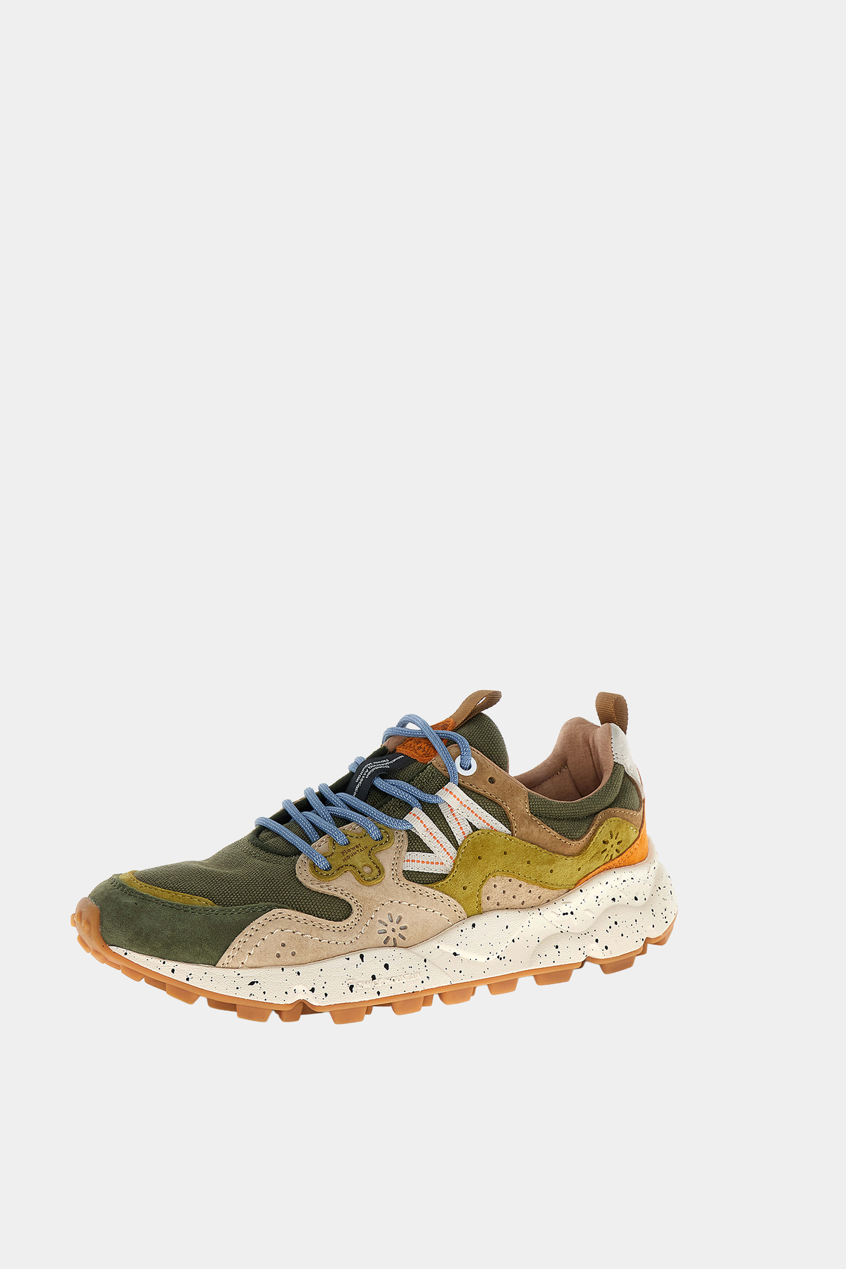 Sneaker Flower Mountain realizzata in tessuto tecnico e canvas, con occhielli rinforzati, lacci trekking, soletta interna in sughero anatomica e antibatterica. Suola in gomma ultraleggera con battistrada dentellato.