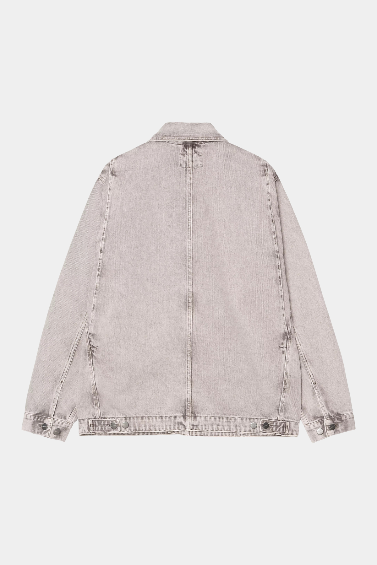 Giubbotto realizzato in pesante denim di cotone non foderato sottoposto a trattamento “chalk wash”, che conferisce al capo una finitura sbiadita effetto polvere. La giacca presenta due doppie tasche anteriori e impuntura a travetta e i rivetti nei punti di maggior usura . Rifinisce il modello l’etichetta quadrata in tessuto, resa opaca dal processo di lavaggio.