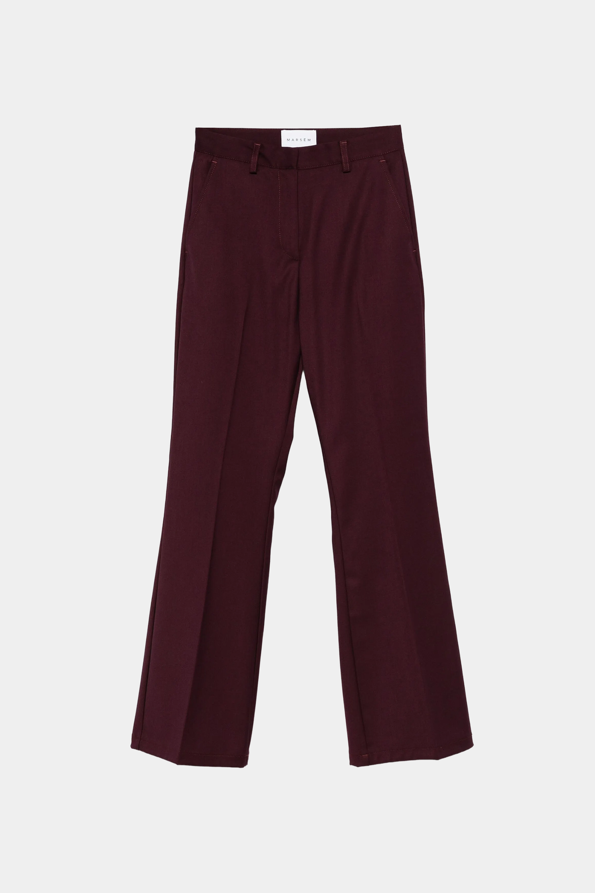 Pantaloni flare con chiusura nascosta e passati per cintura, sono presenti tasche a filetto laterali e due tasche a filetto posteriori. Il pantalone presenta una gamba flare che si va ad allargare sulla caviglia.