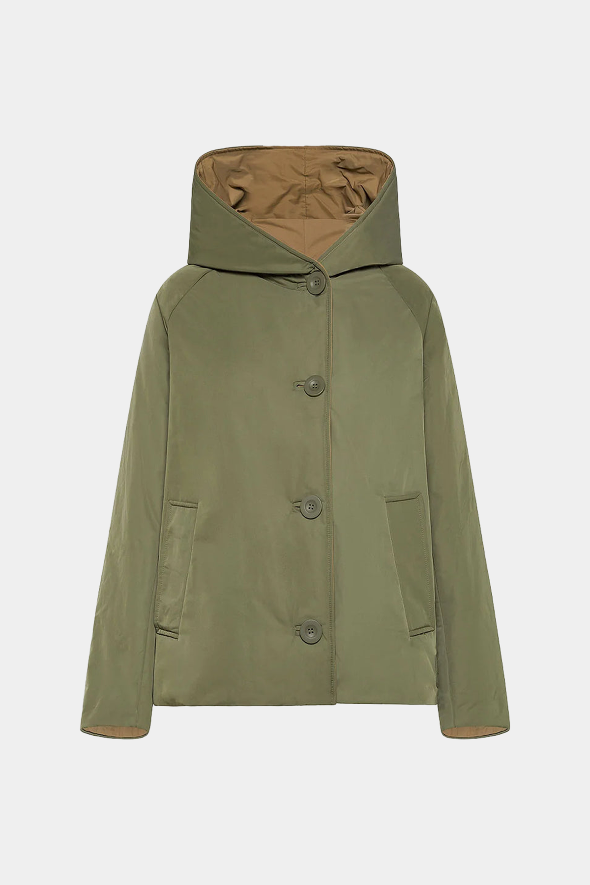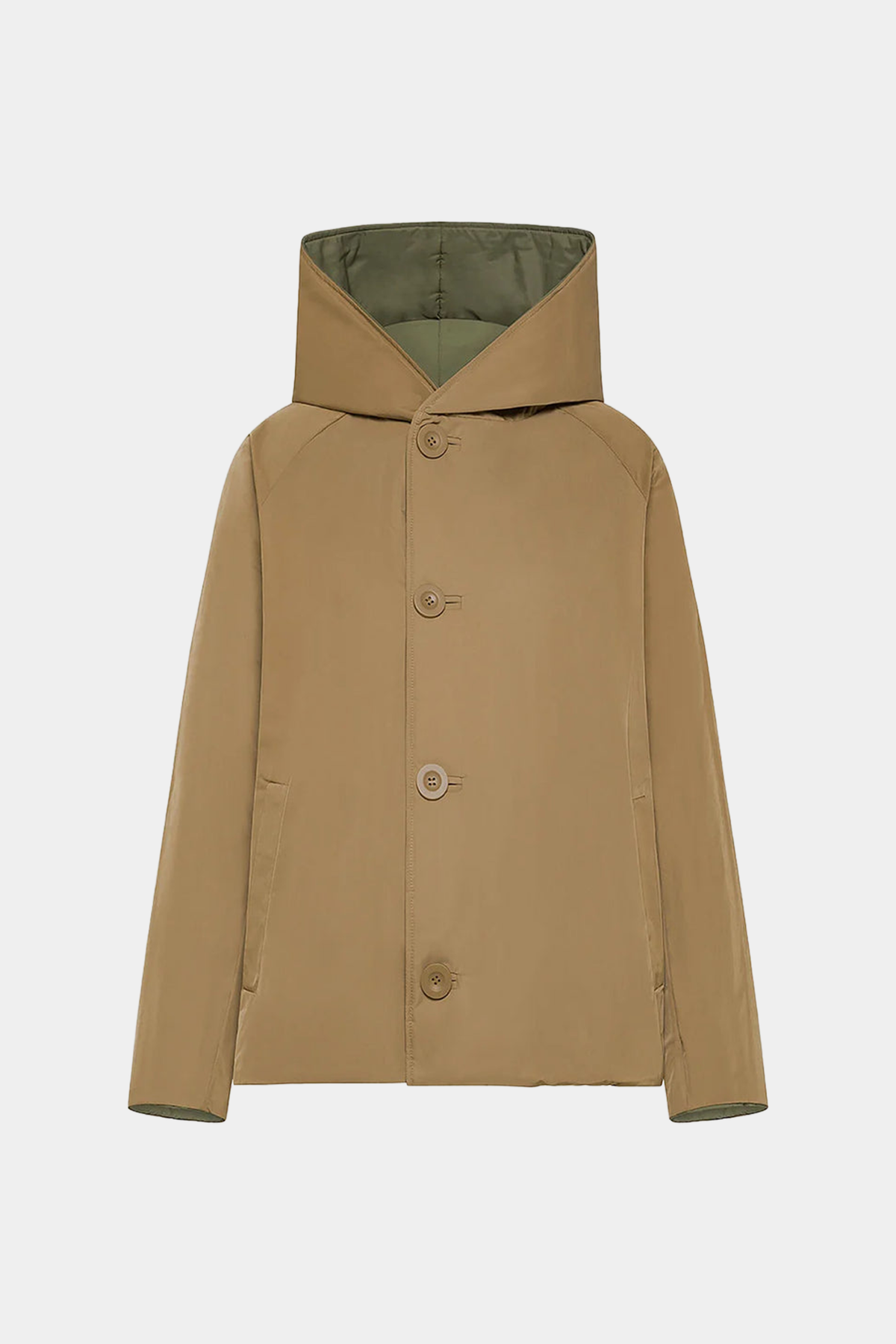 Giubbotto corto reversibile realizzato in nylon memory water-repellent. Presenta abbottonatura frontale, scollo a scialle con cappuccio e maniche raglan, sono presenti tasche a toppa laterali. Il giubbotto ha una vestibilità comoda.