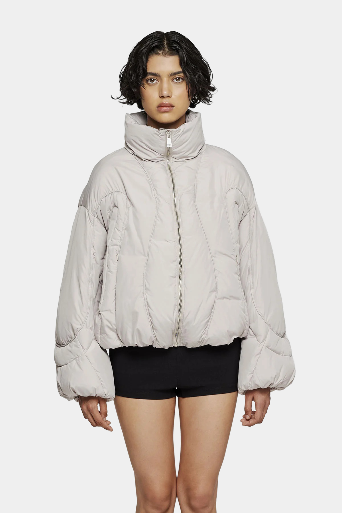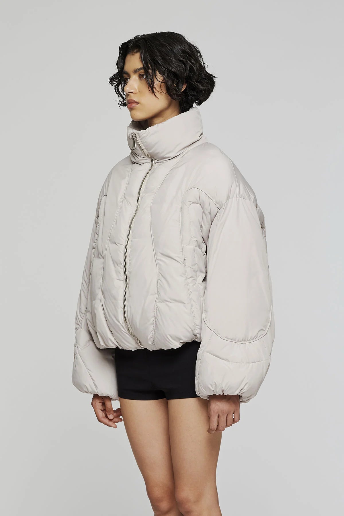 Giacca puffer imbottita realizzata in nylon riciclato water repellent, presenta collo alto e chiusura frontale con cerniera e maniche ampie con giromanica abbassato. Sono presenti tasche laterali a filetto con cerniera.