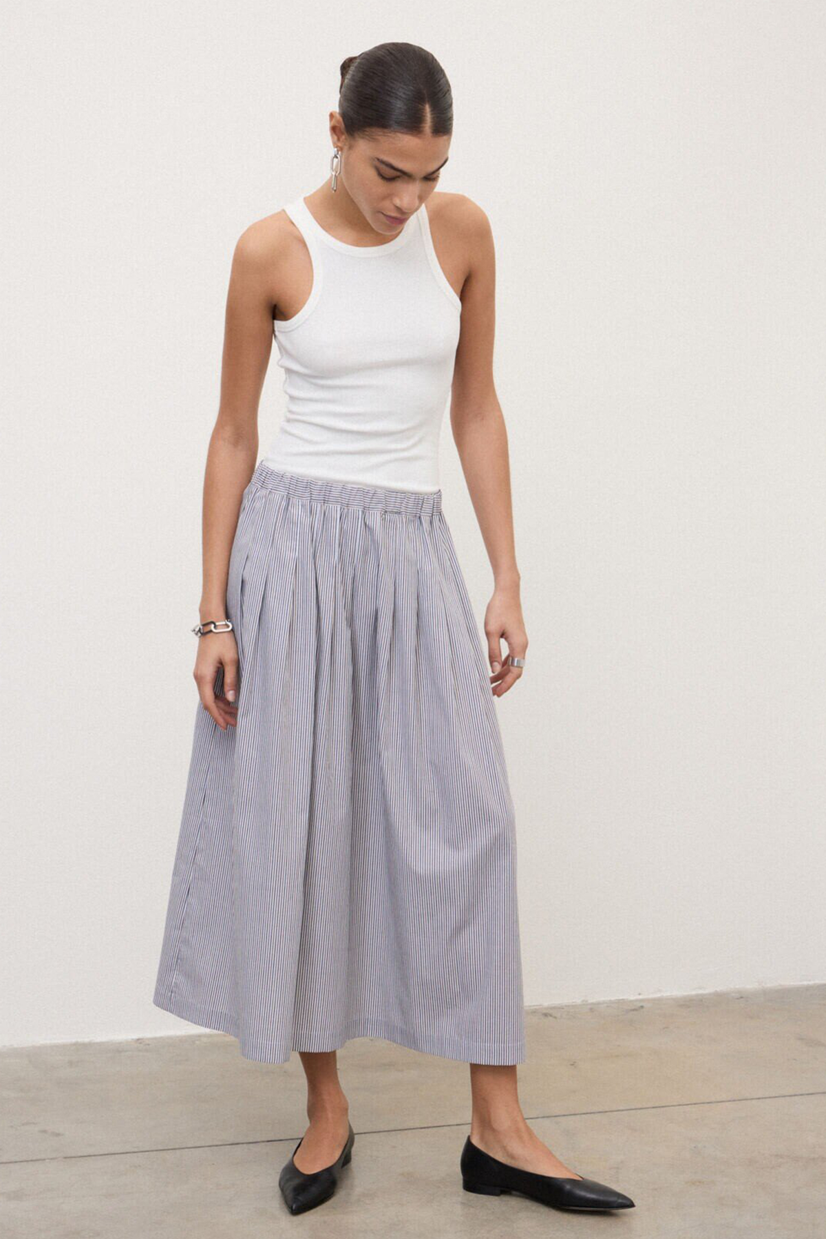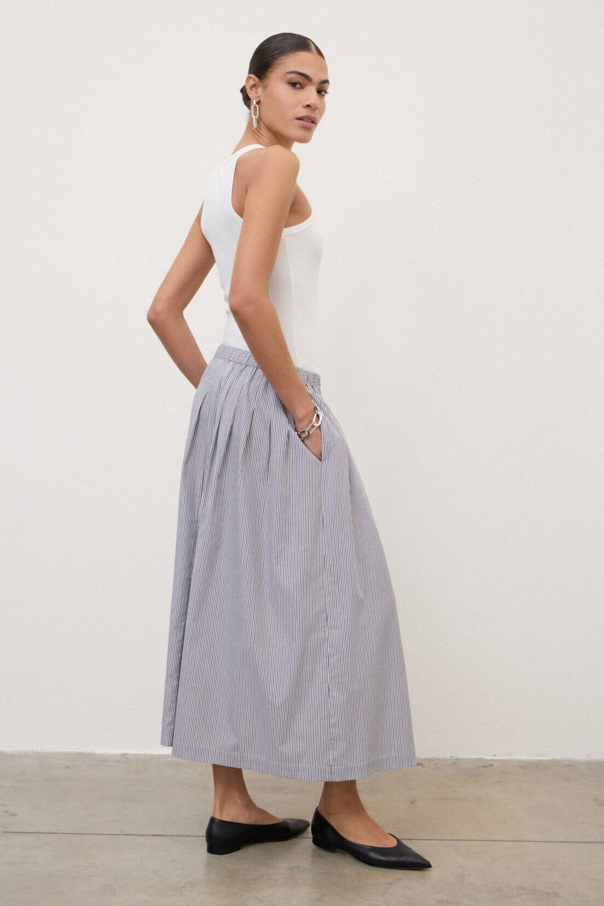 Gonna lunga a righe con vita elasticizzata e pieghe, sono presenti tasche a filetto laterali.