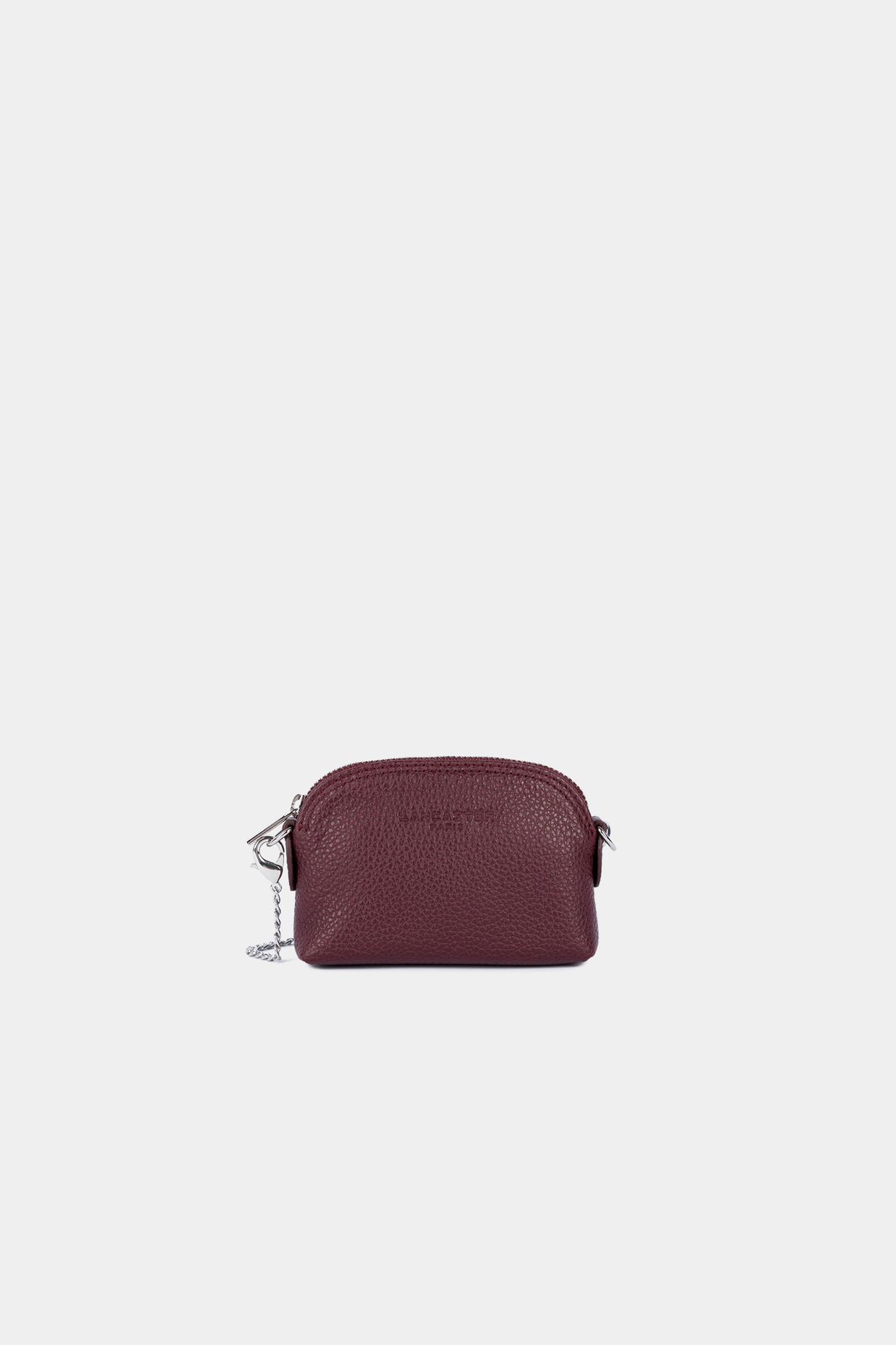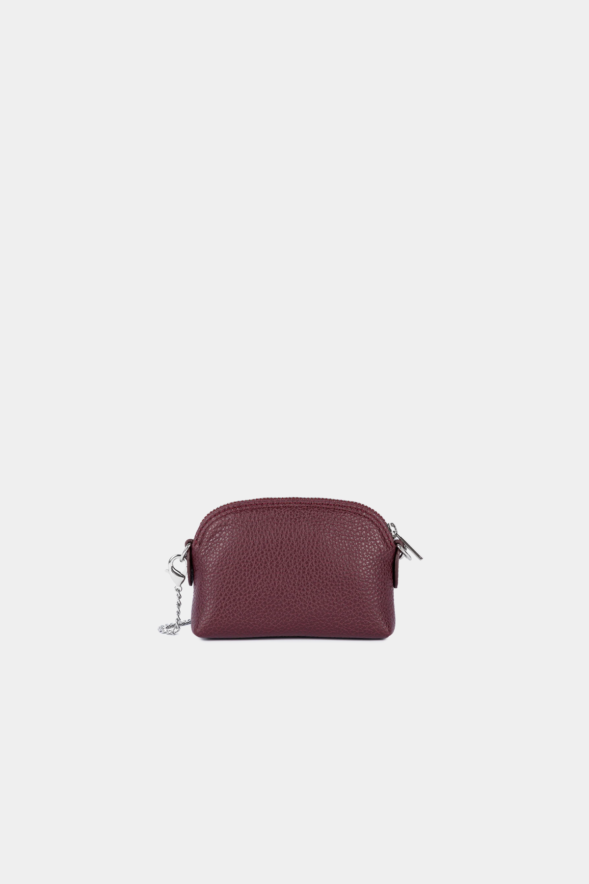 Portamonete realizzato in pelle granata con cerniera e tracolla a catena.