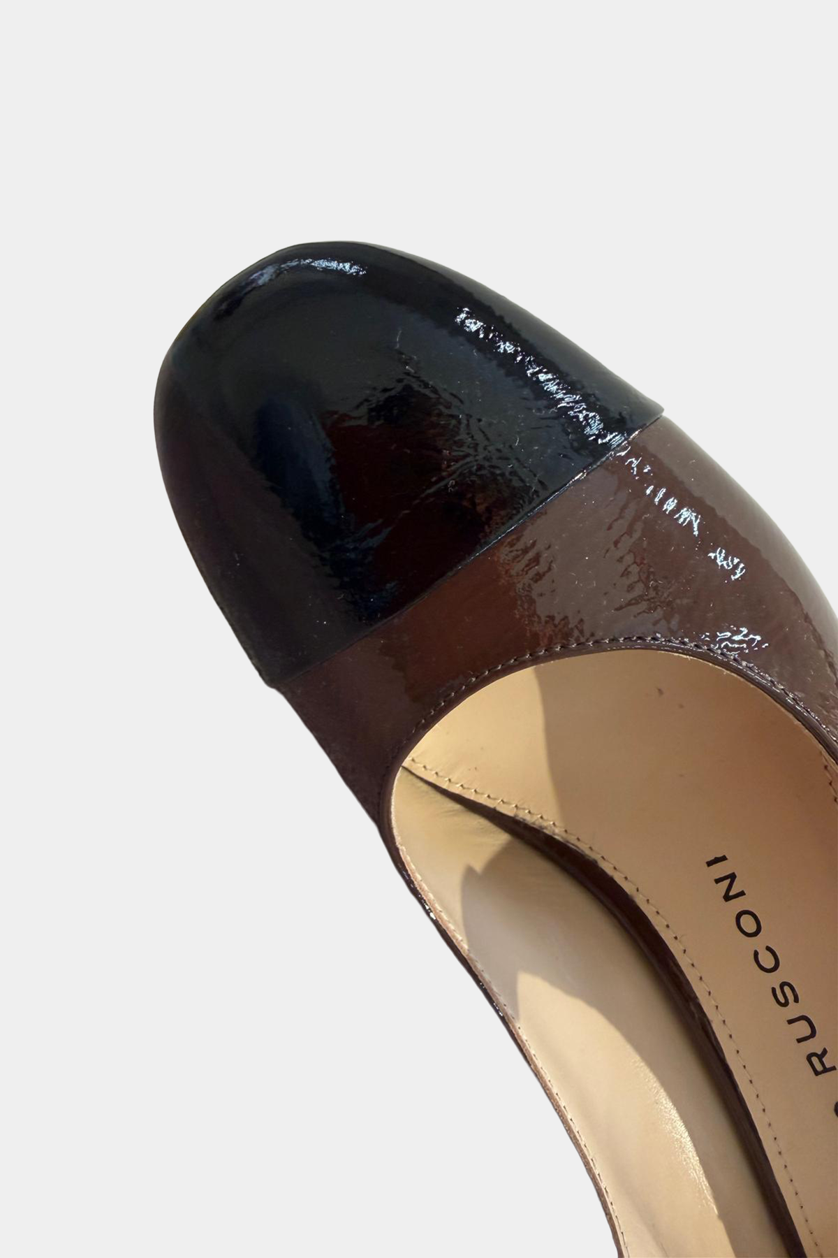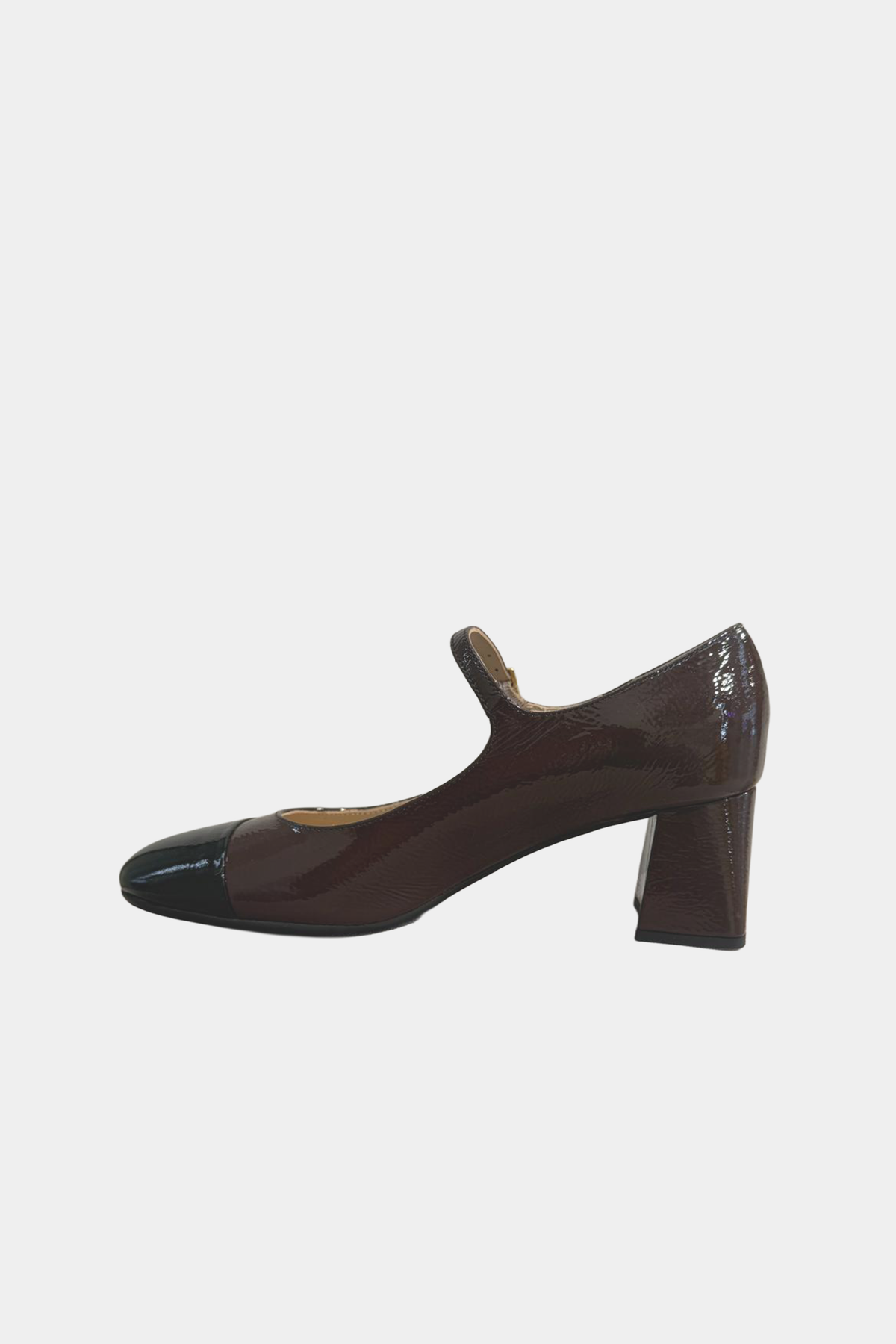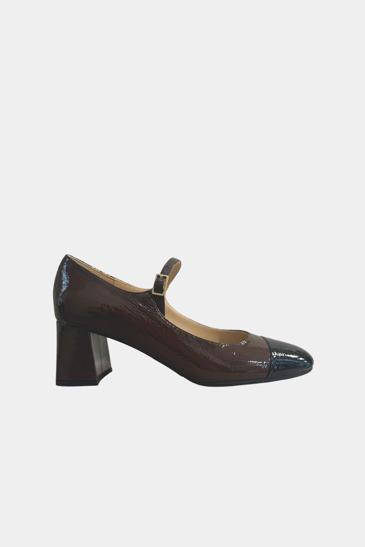 Mary Jane realizzata in vernice con cinturino regolabile e punta a contrasto colore.