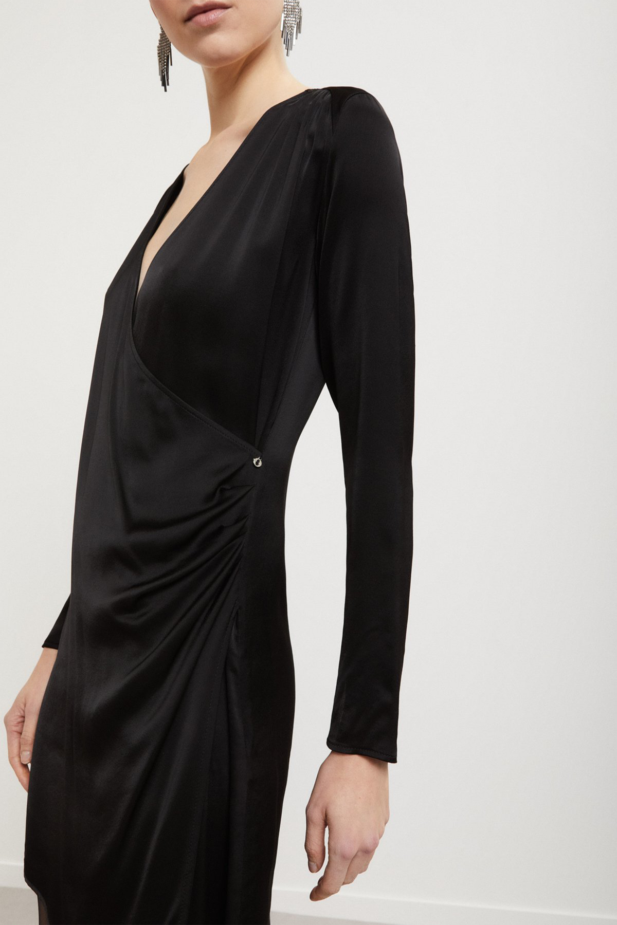 Abito corto satin a manica lunga con scollo a V e chiusura posteriore, è presente un drappeggio sul fianco.