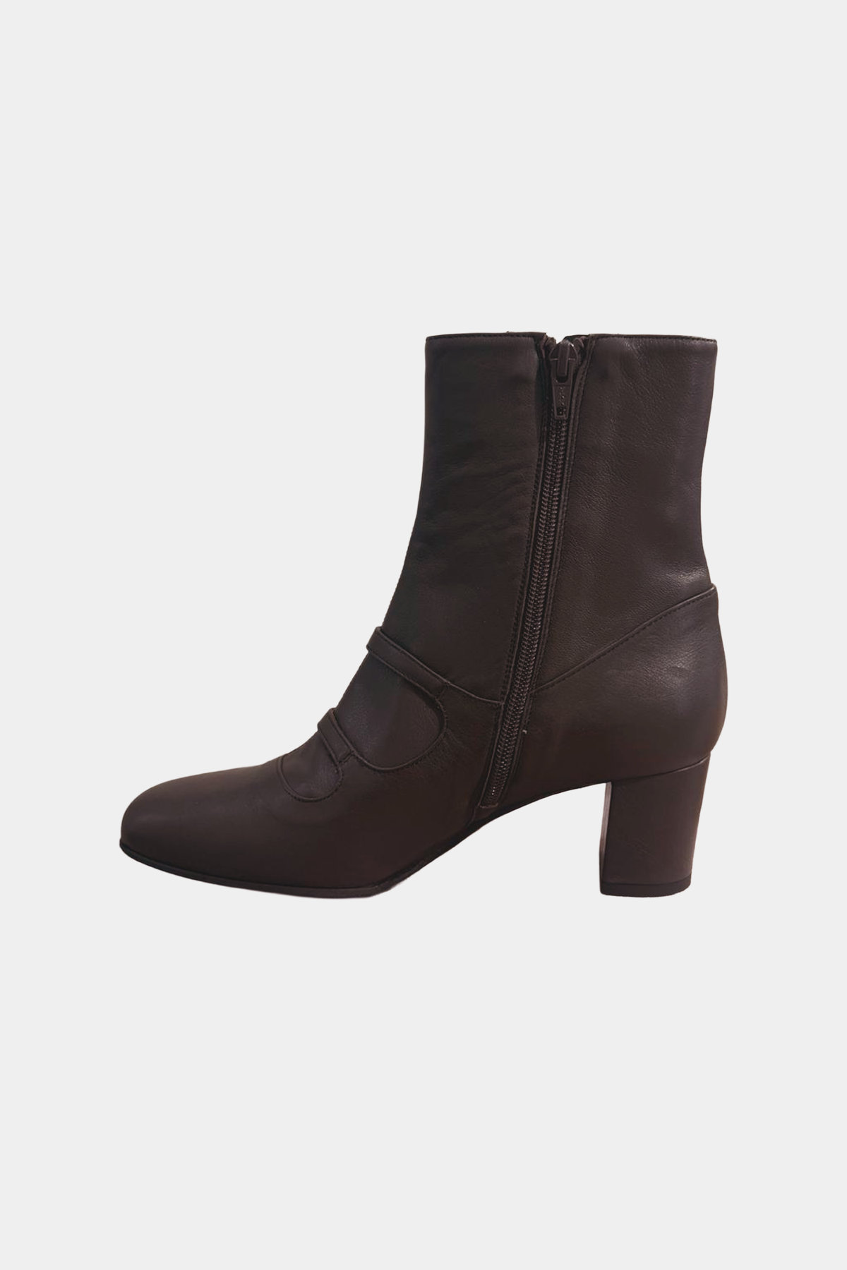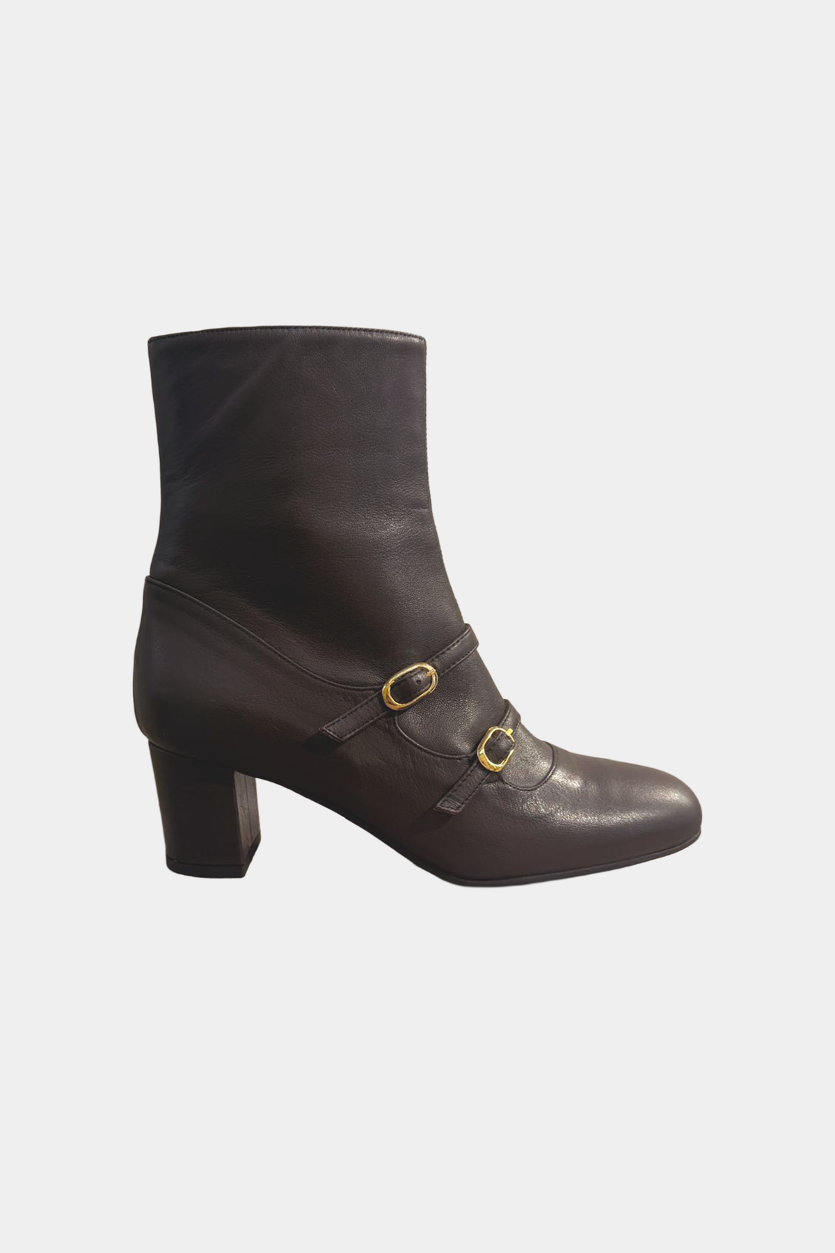 Stivaletto in pelle con tacco, chiusura con cerniera e dettaglio di doppia fibbia color oro.