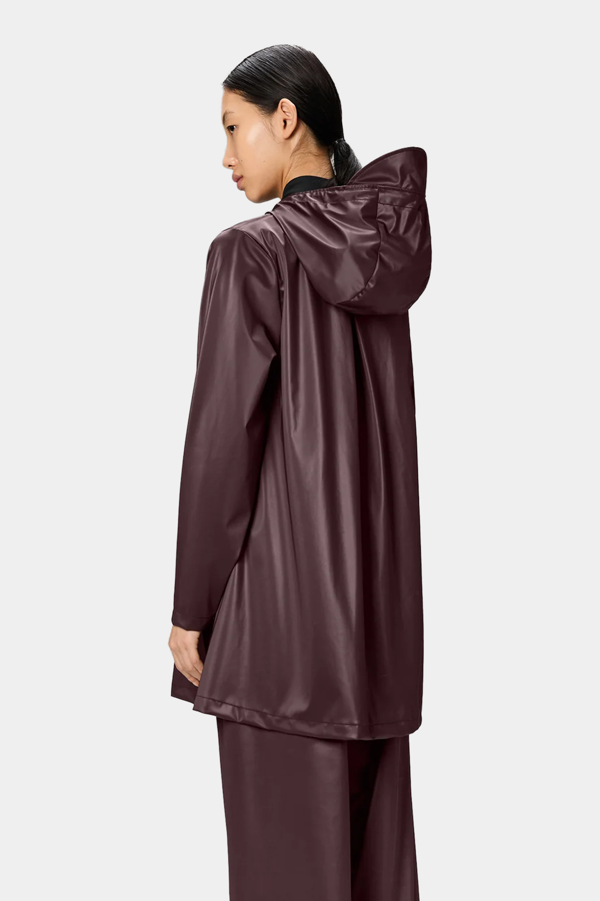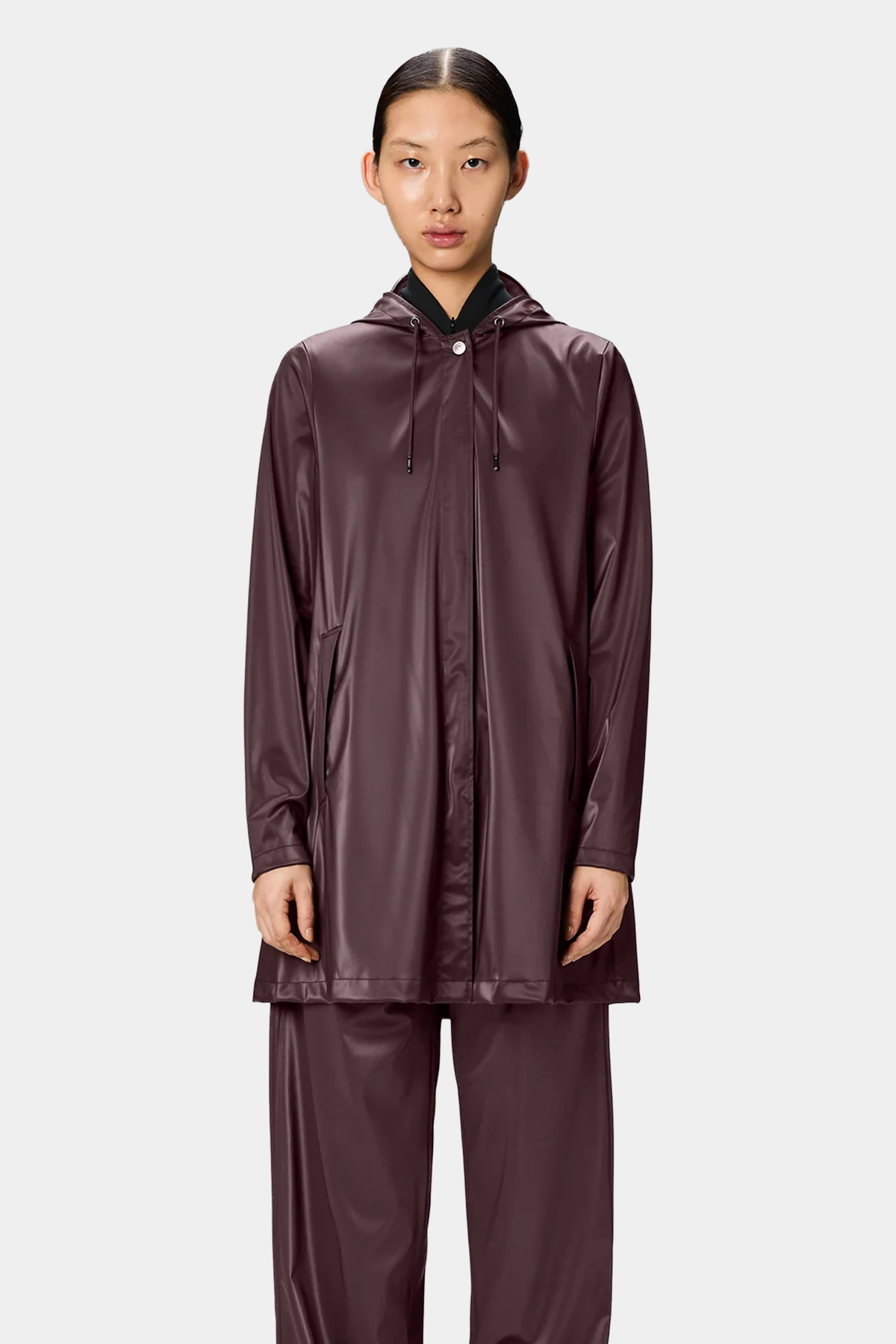 Giacca da poggia impermeabile ed antivento. Chiusura frontale con bottoni e cappuccio con cappellino regolabile con coulisse. Sono presenti tasche a filetto laterali, cannoncino posteriore, polsini regolabili con bottoni e fondo svasato. Questa giacca impermeabile è realizzata in tessuto PU firmato Rains e presenta cuciture saldate a ultrasuoni. Protegge dalla pioggia leggera.