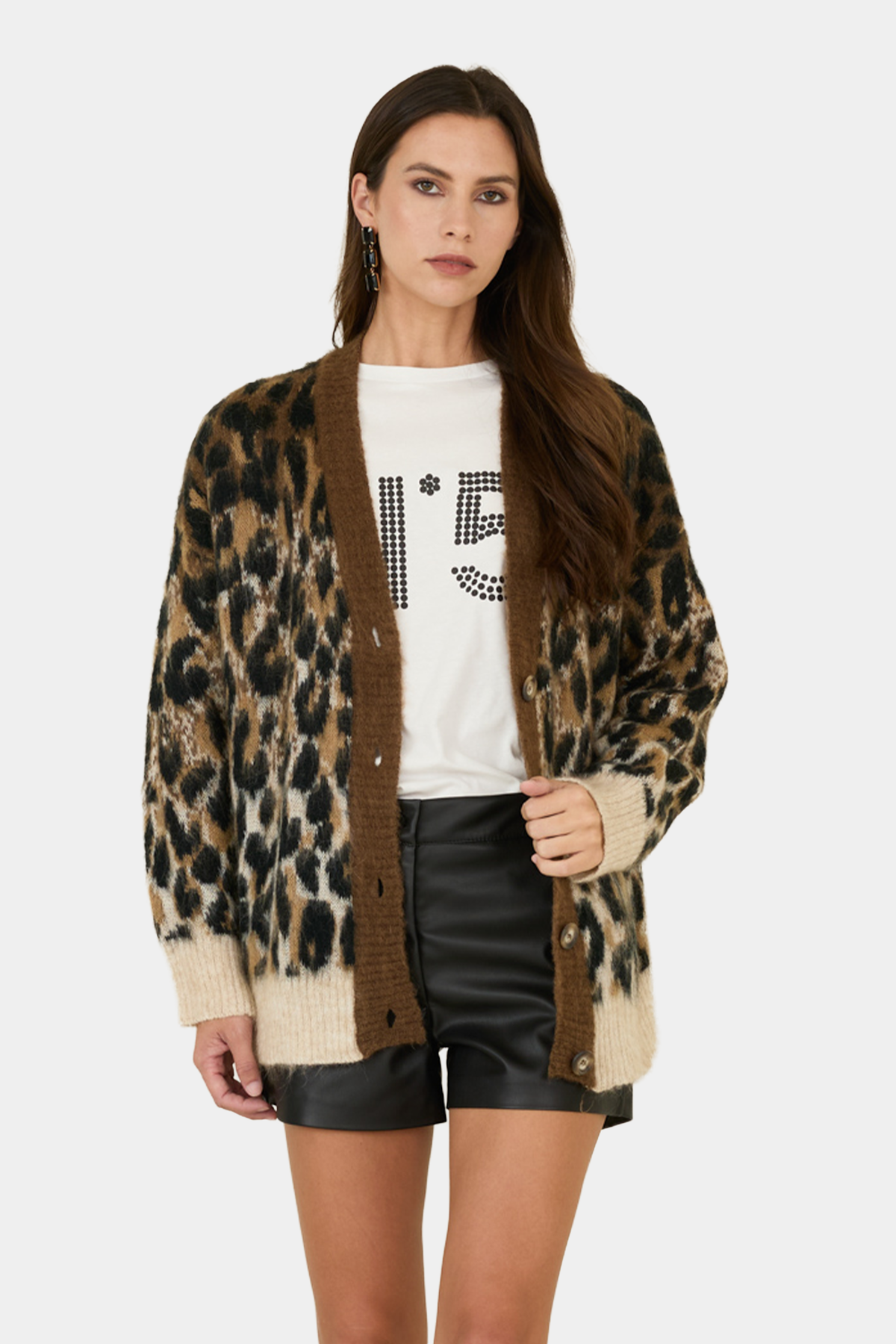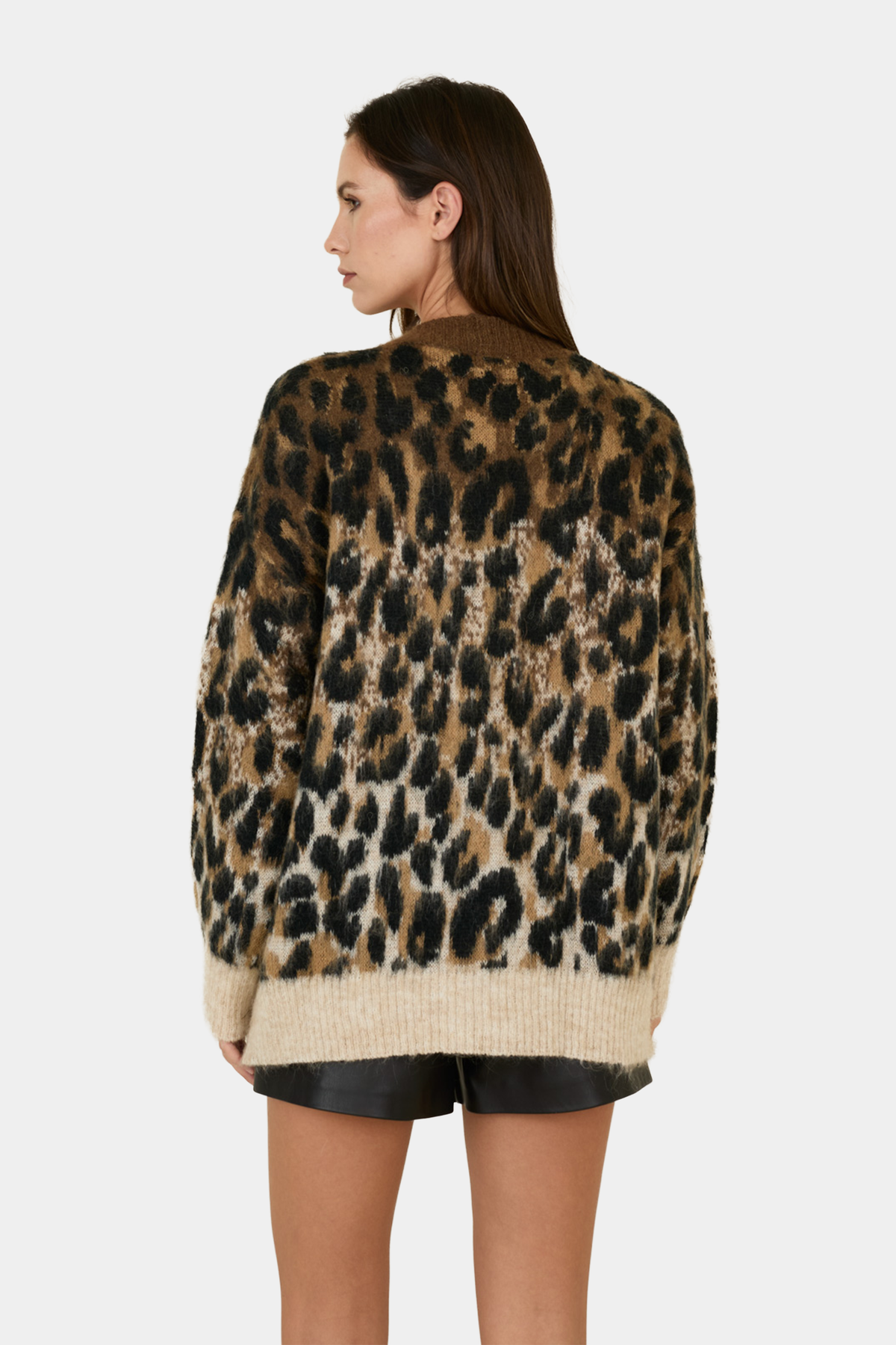 Cardigan fantasia animalier realizzato in misto mohair, scollo a V e abbottonatura frontale, polsini fondo e orlo lavorati a costine.