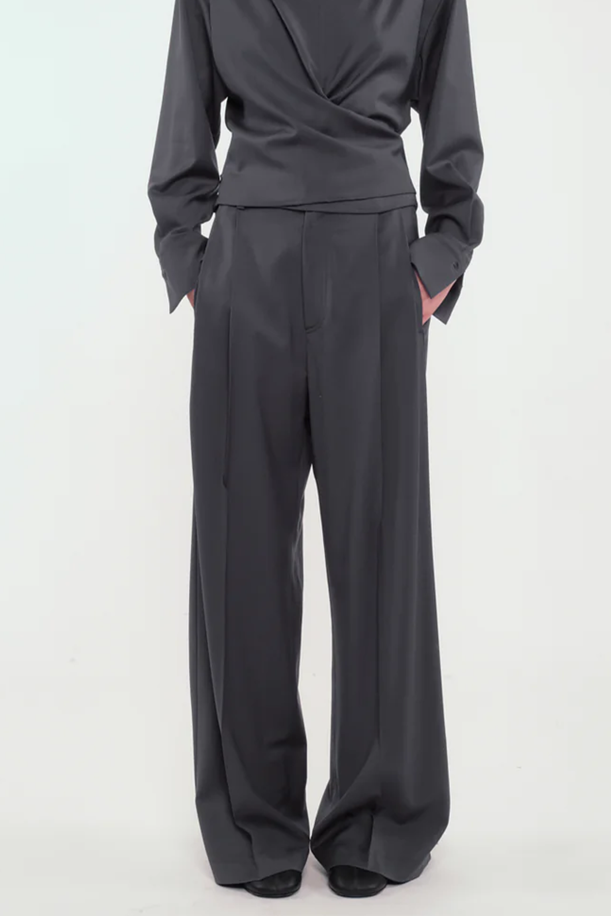 Pantaloni realizzati in lana tecnica, chiusura con cerniera e gancino nascosto e elastico in vita nella parte posteriore. Sono presenti pences frontali, tasche a filetto laterali e una posteriore. Il pantalone presenta una gamba rilassata e vita regolare