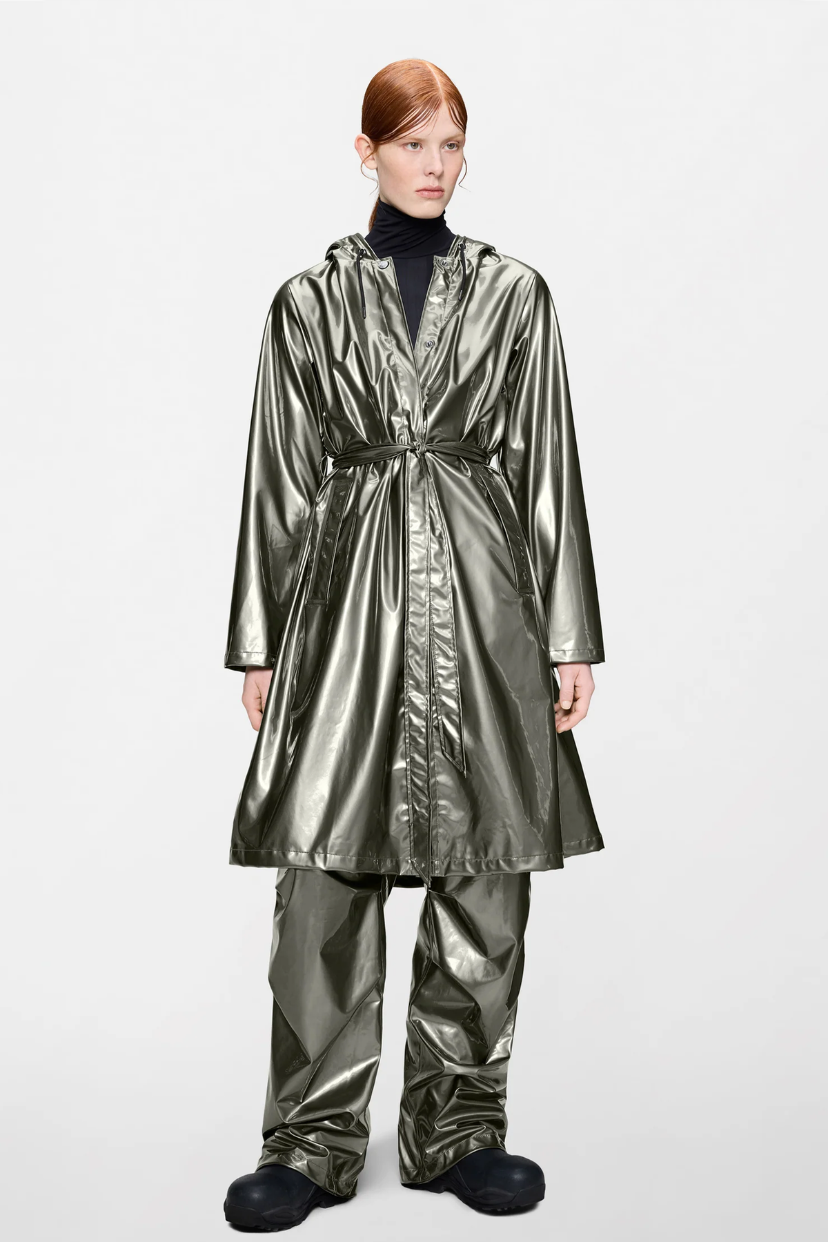 Impermeabile lungo A-Line impermeabile donna presenta una silhouette trapezoidale e una cintura rimovibile che sottolinea il punto vita per un tocco di eleganza. Il tradizionale cappuccio con coulisse e tasche laterali ti terranno al sicuro dalle intemperie, mentre i polsini regolabili e la cintura ti offrono il massimo comfort. Realizzato con il leggero tessuto PU di Rains.