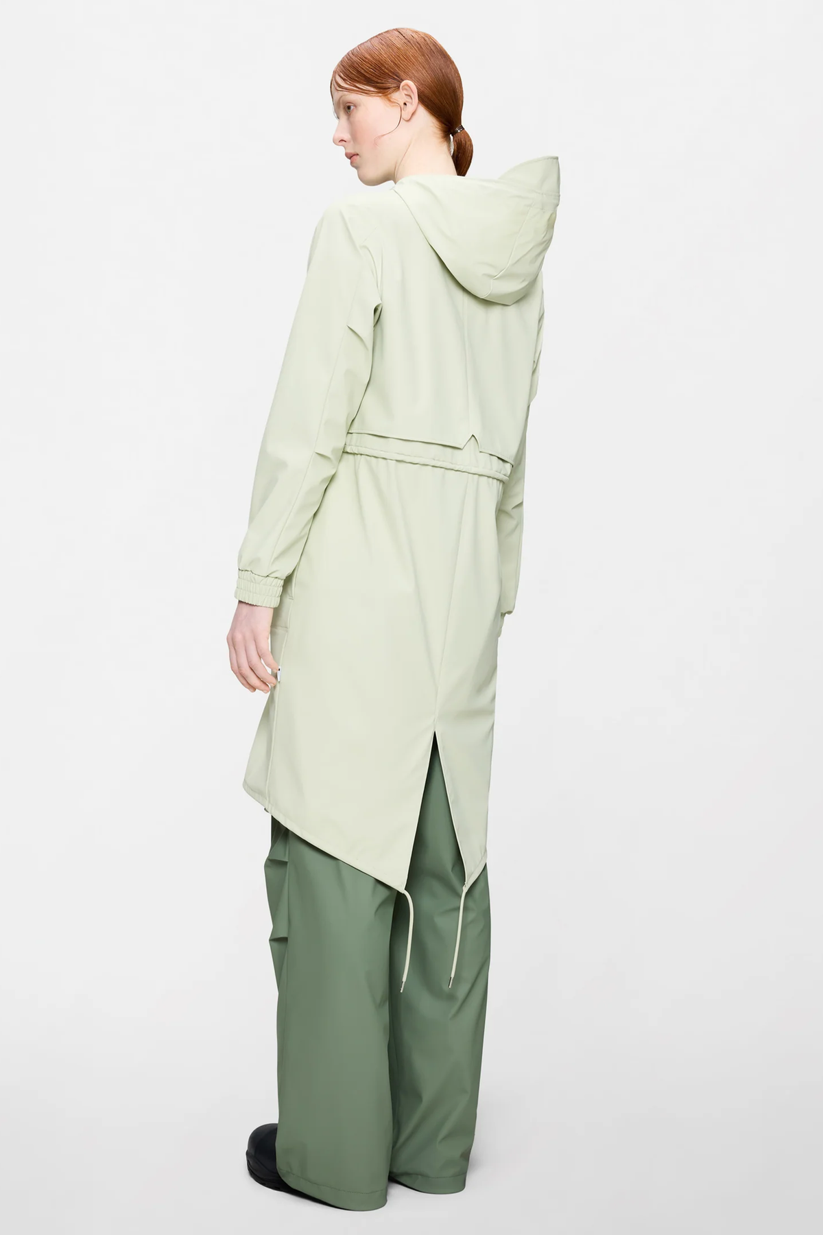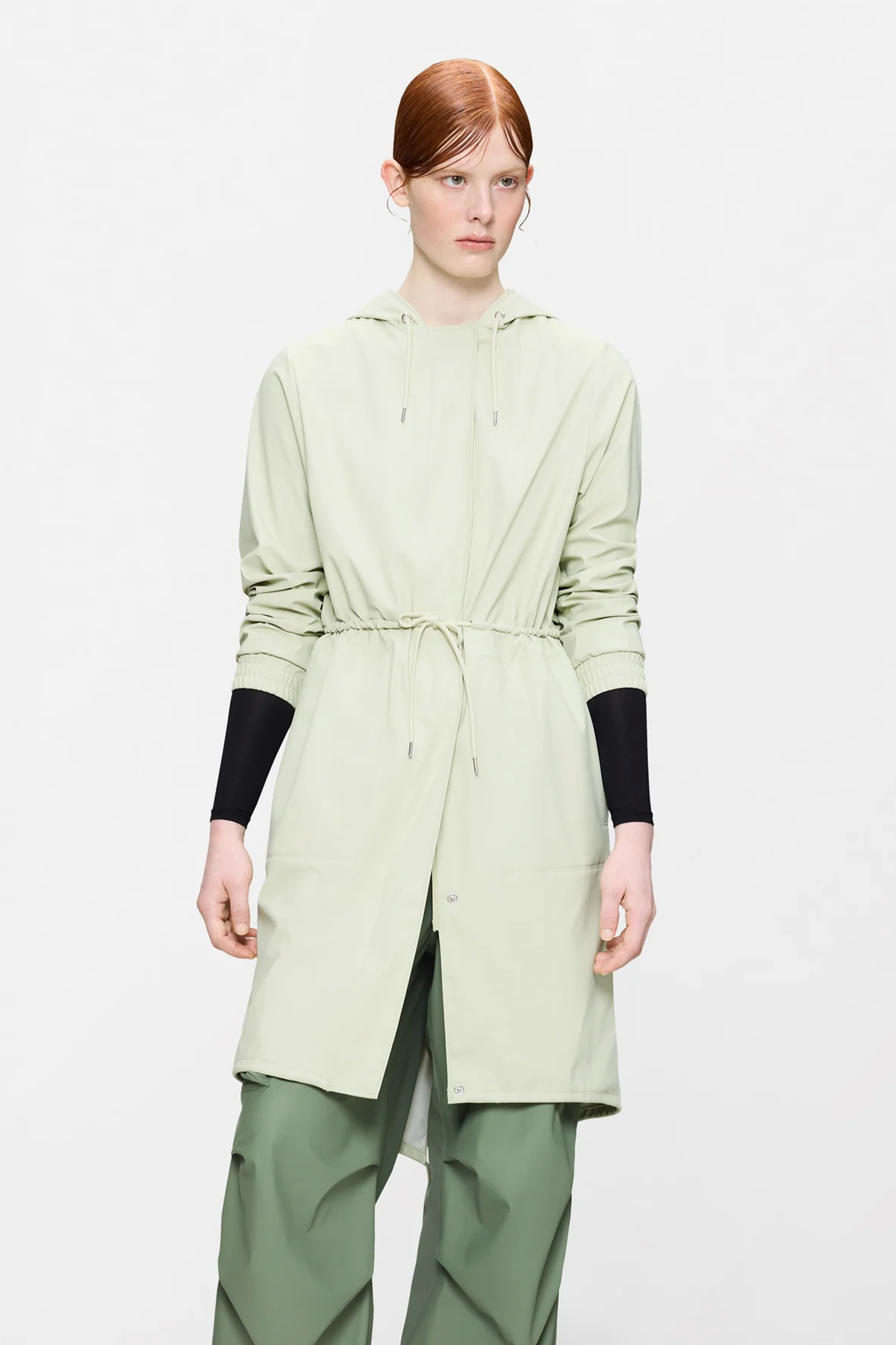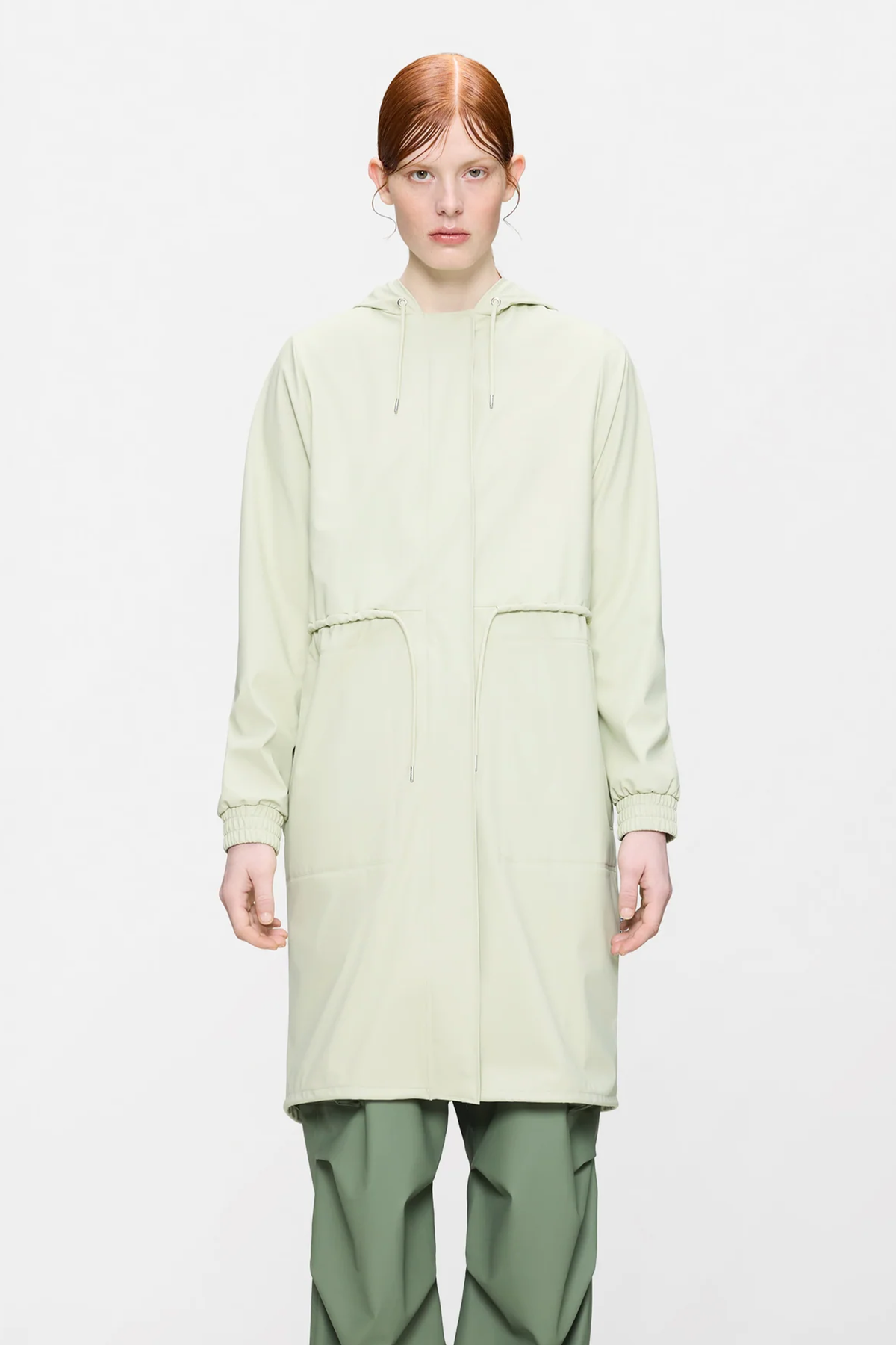 Parka impermeabile con cappuccio con coulisse e visiera, chiusura con cerniera rivestita. Gli occhielli sotto le braccia e i fori di aerazione ascosti sulla mantellina posteriore garantiscono un comfort traspirante. Sono presenti tasche laterali ed una coulisse in vita. Lo String W Parka è realizzato nell'iconico tessuto PU di Rains e presenta cuciture nastrate. La mano è leggera, con un drappeggio elegante e morbido al tatto.