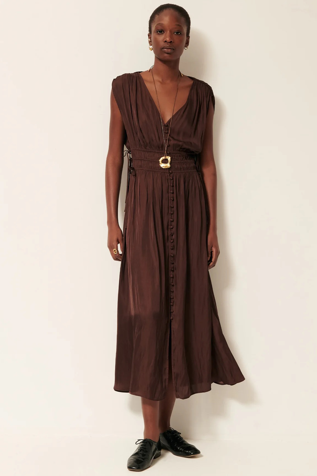 Abito lungo con bottoni a punto smock in satin fluido leggermente increspato, presenta abbottonatura frontale con bottoni rivestiti, scollo a V, dettagli increspati sulle spalle, e laccini in vita regolabili. L'abito ha una vestibilità regolare.