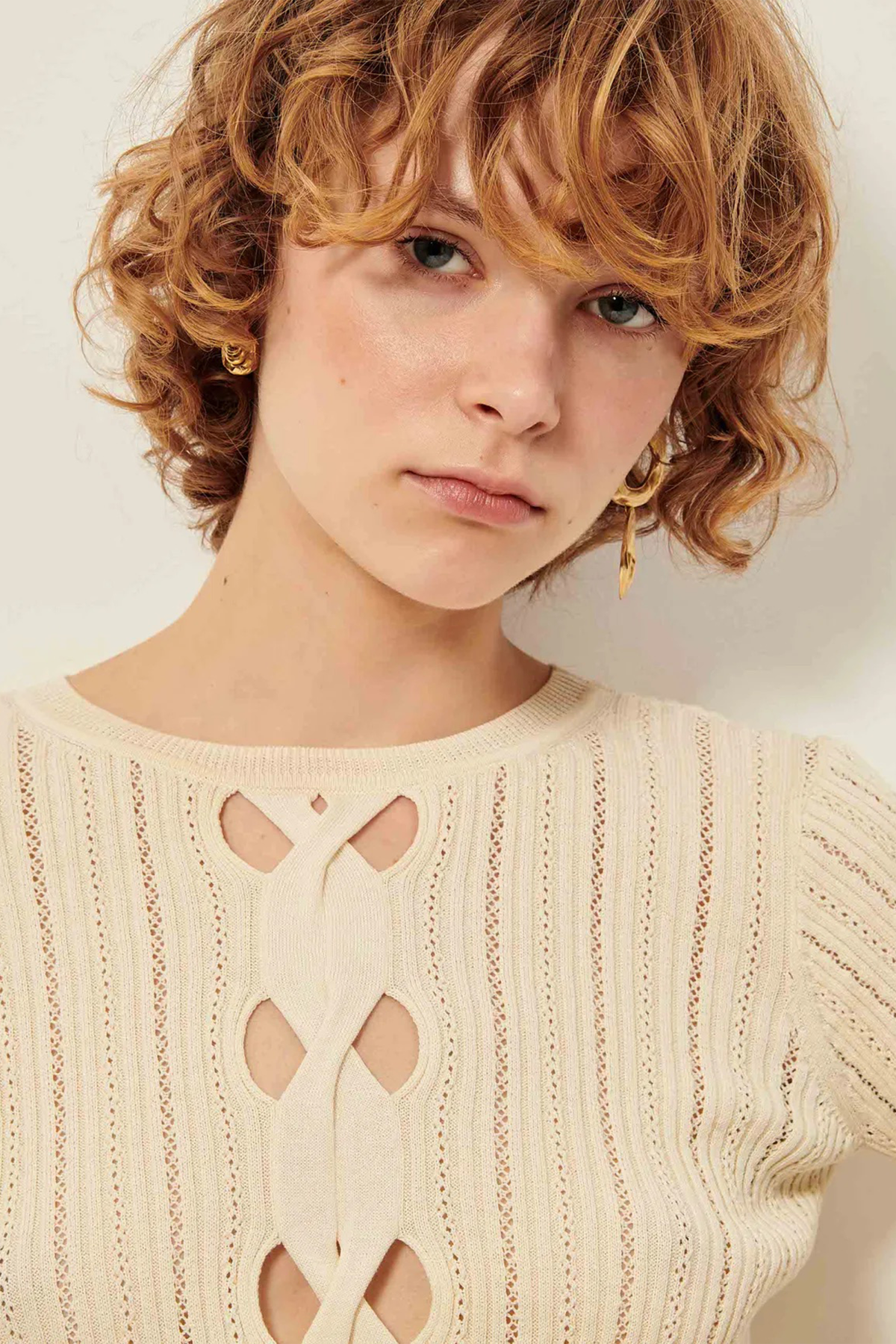 Maglia girocollo reversibile realizzata in maglia a coste con con maniche a 3/4, dettagli traforati e intreccio con dettagli cut-out.