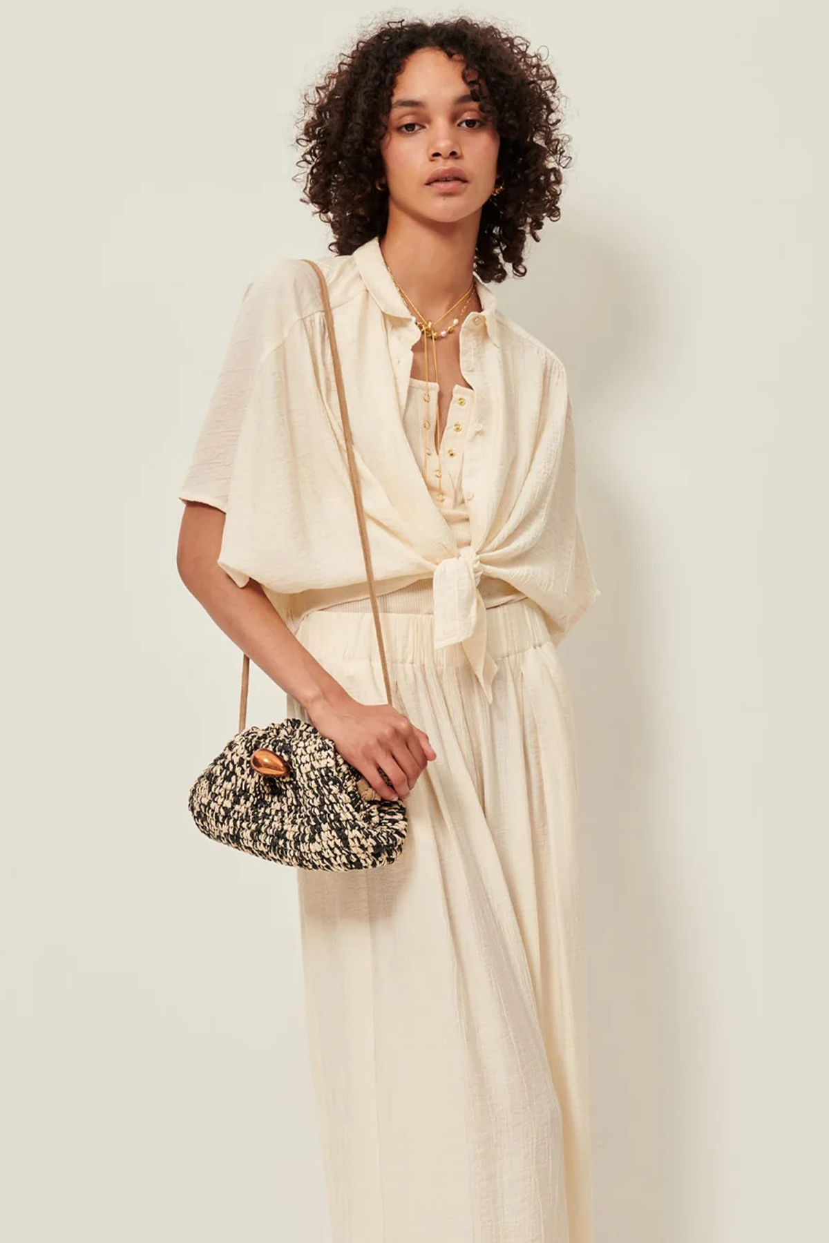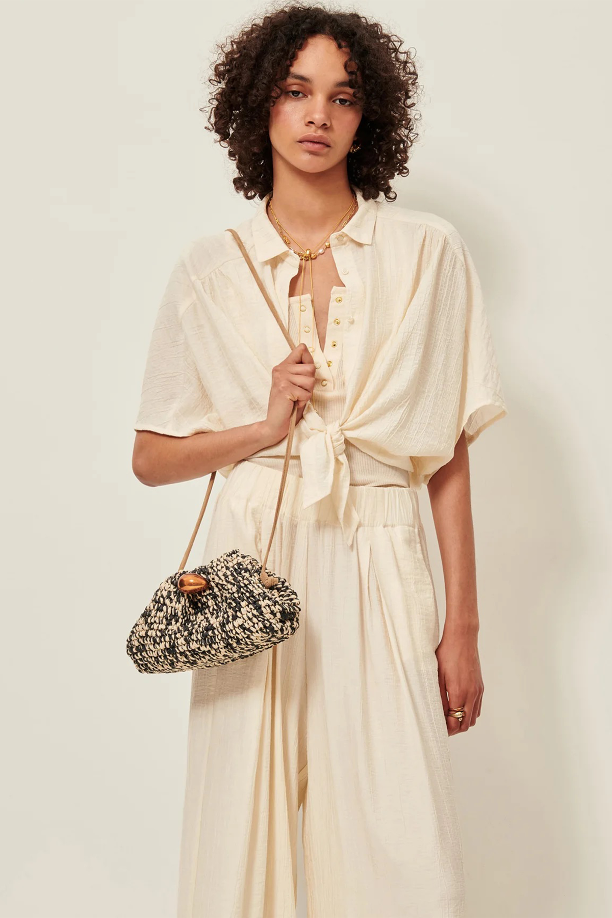 Camicia a manica corta realizzata in morbido crêpon seersucker di viscosa, abbottonatura frontale con colletto revers e fascia da annodare sul fondo nella parte frontale. La camicia presenta inoltre spalle scese raglan, retro con fondo elasticizzato e dettagli di arricciature.