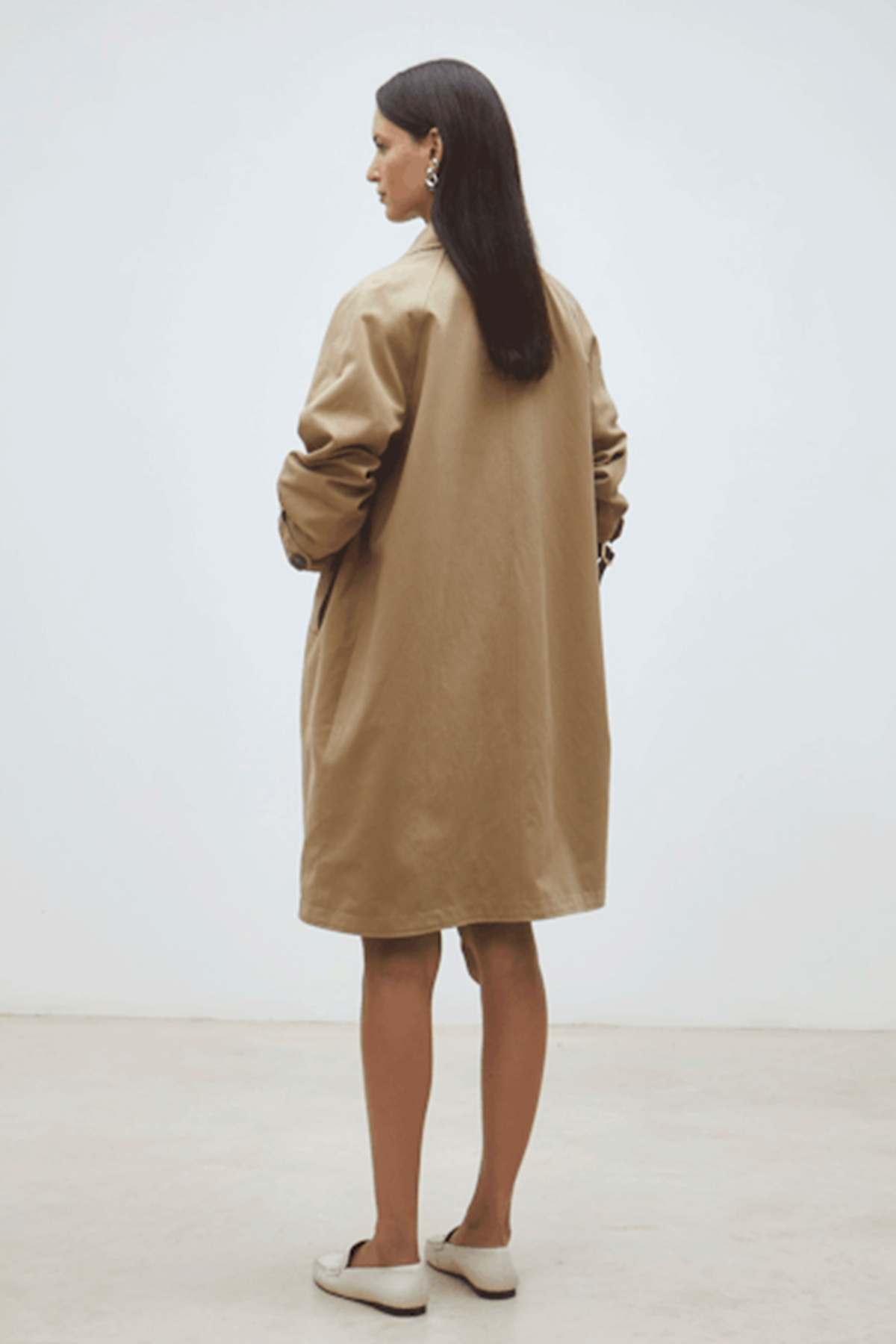 Spolverino reversibile con colletto revers e abbottonatura frontale, sono presenti due tasche laterali a filetto e martingala sui polsini.